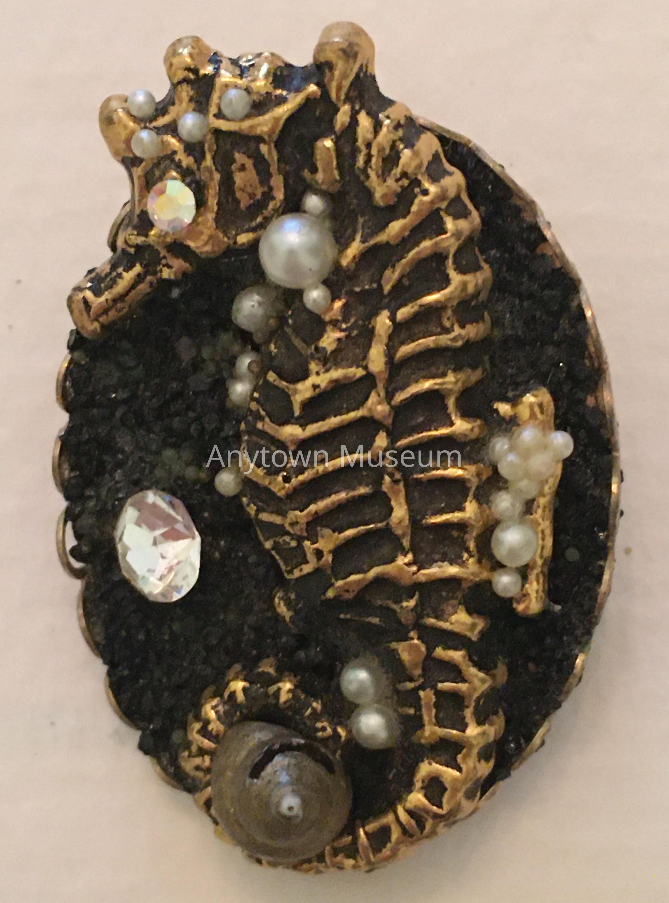 Oval brooch depicting a seahorse adorned with small pearls, a shell, and crystalsAcquisition