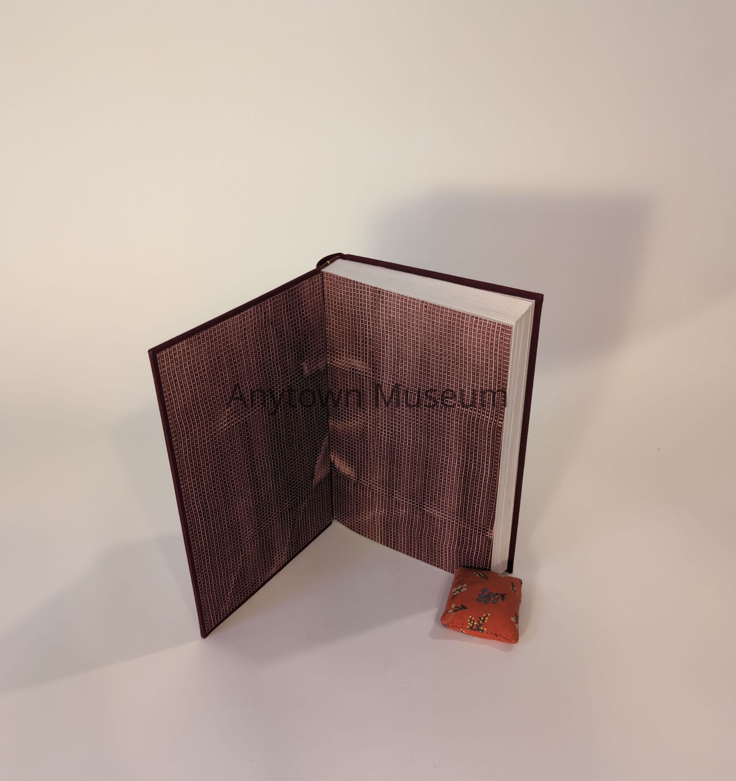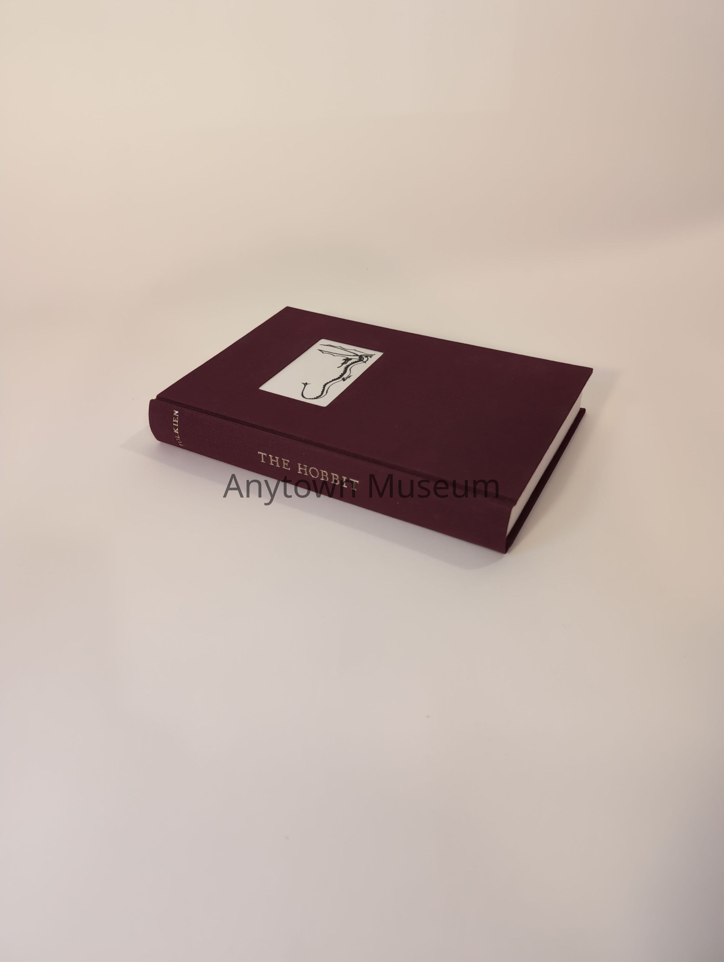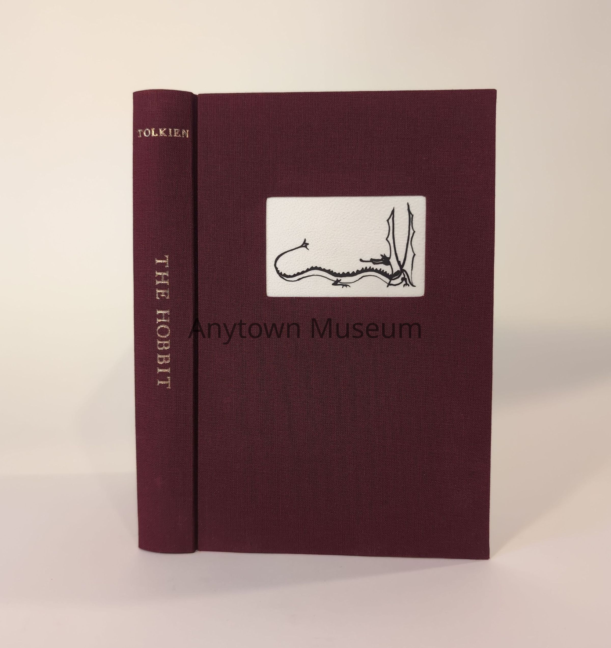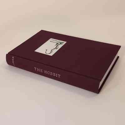 A hardcover book bound in maroon cloth with an inset rectangle of parchment that has JRRT's drawing of Smaug on it it. Paste paper endpapers, leather headband with sewn gold ring at center.Collection