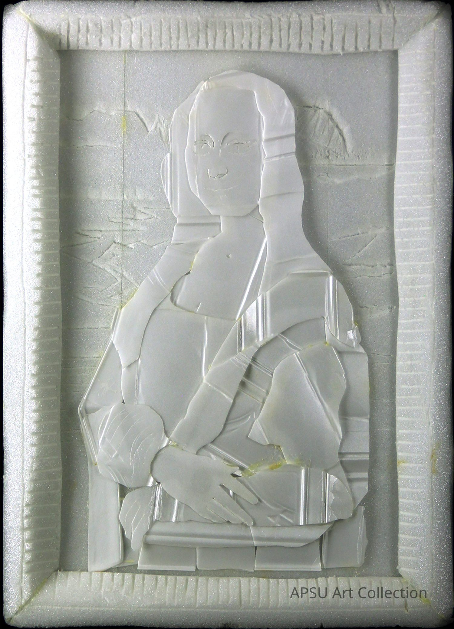 The image depicts a creative interpretation of the iconic portrait, constructed entirely from shards of broken glass meticulously arranged within a textured Styrofoam frame. The styrofoam pieces collectively form the familiar silhouette and subtle elements of the well-known expression, capturing the essence of the original artwork with a distinct yet delicate transparency. The rough, reflective surface of the glass contrasts with the smooth, foam background, adding a contemporary twist to the composition. This three-dimensional piece showcases artistic ingenuity, merging classical inspiration with modern materials.