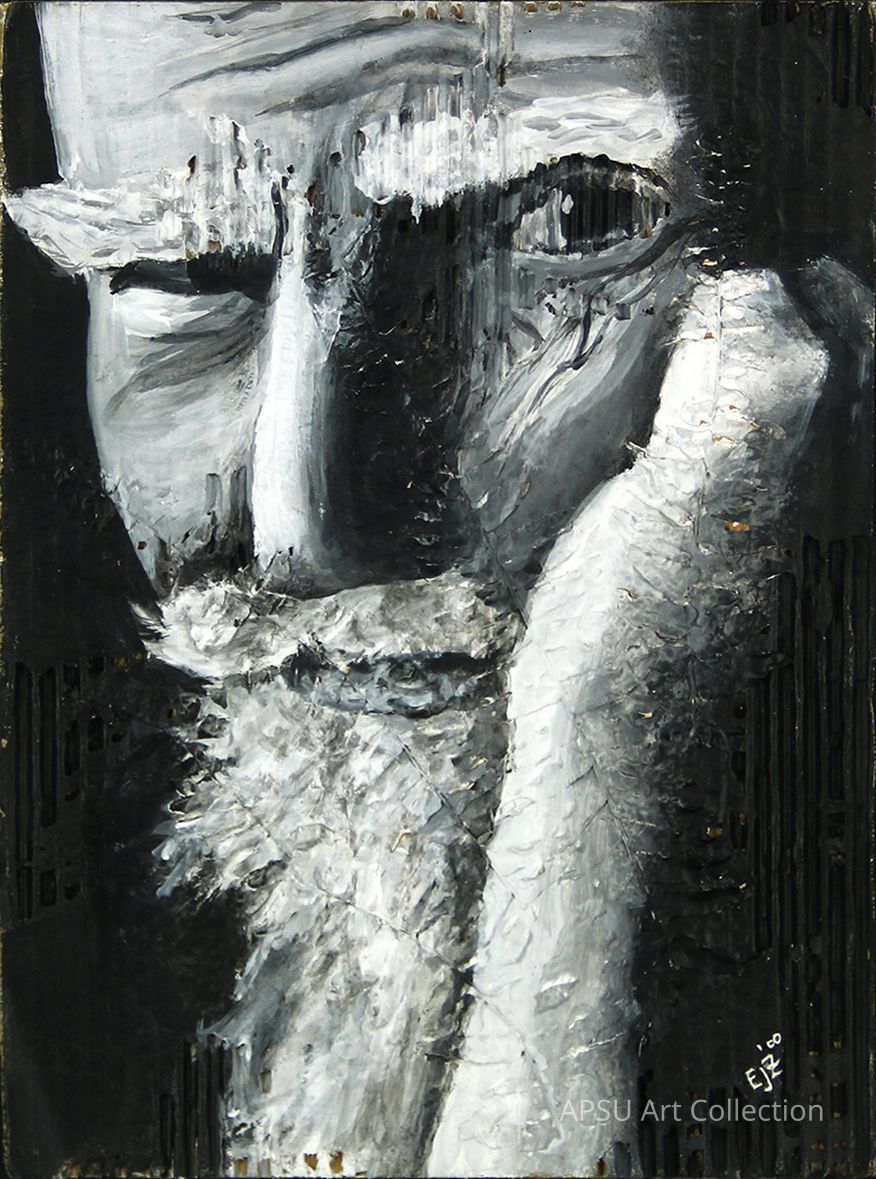 The image is a monochromatic painting featuring a close-up of a face with a contemplative expression, marked by deep, bold brush strokes in shades of black, white, and gray that give the portrait a rich texture and evoke a feeling of introspection and depth; the figure's features, such as a furrowed brow and a thoughtful hand resting on the chin, suggest a moment of deep reflection, while the abstract play of light and shadow across the face adds an element of mystery.