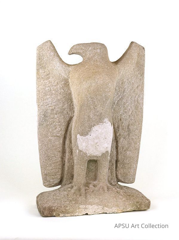 The image features a stone sculpture of an eagle, carved with notable detail, capturing the majestic essence of this bird of prey, showcasing its powerful wings folded close to its body and a sharp, curved beak, poised as if surveying its surroundings with regal authority; the stone surface, slightly weathered, suggests a rich history and craftsmanship, possibly indicating that the sculpture is an artifact from an ancient civilization, where eagles symbolized strength and freedom, standing on a firm base with its talons gracefully sculpted.