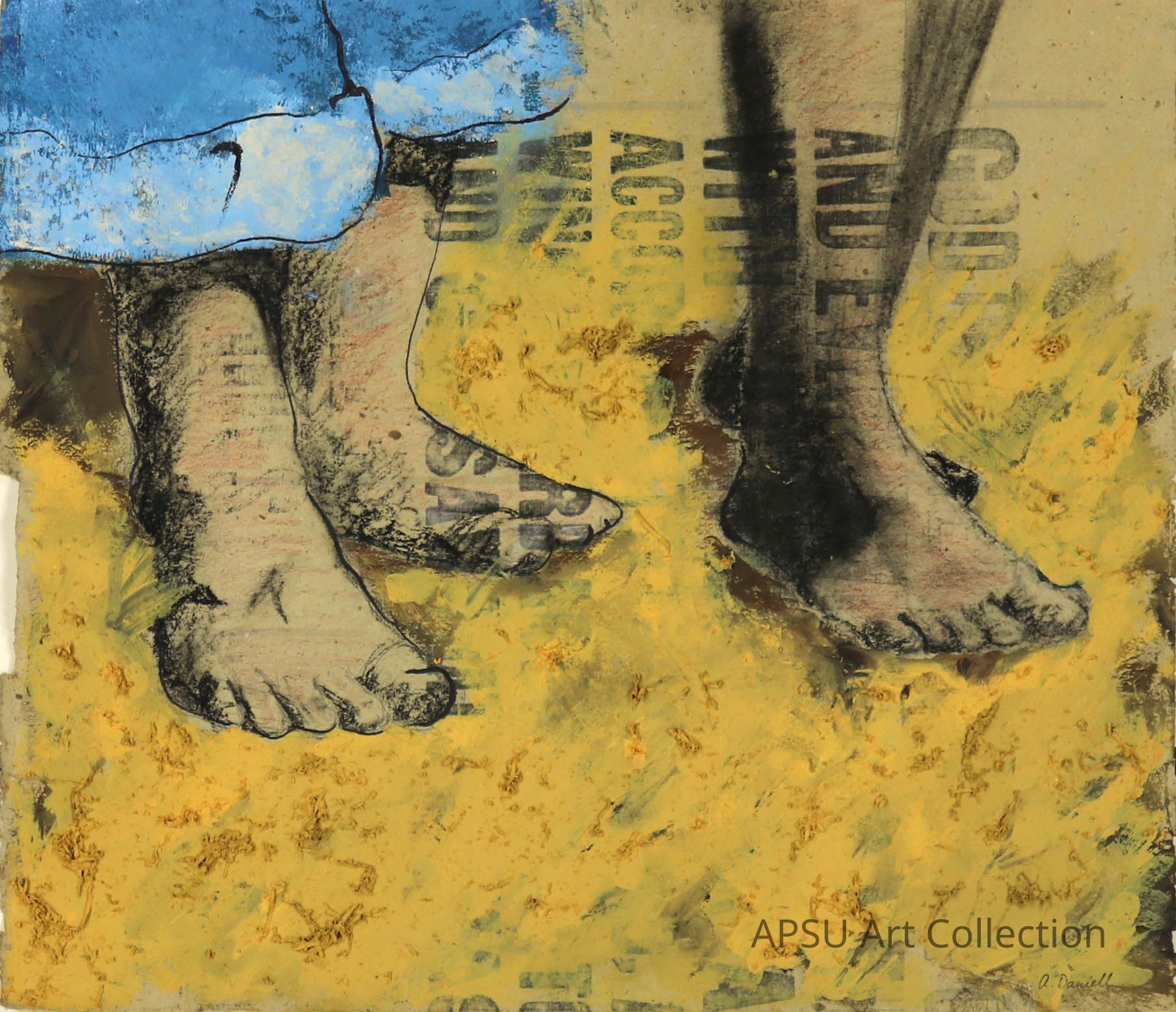 The image appears to be an artistic depiction of two pairs of bare feet standing on a textured, yellowish surface with newspaper-like text faintly visible. The feet on the left, partially covered by the hem of a blue garment, suggest a sense of movement with overlapping and crossed toes. The right pair of feet, rendered in a darker shade, seem grounded, setting a contrast with their bent appearance.