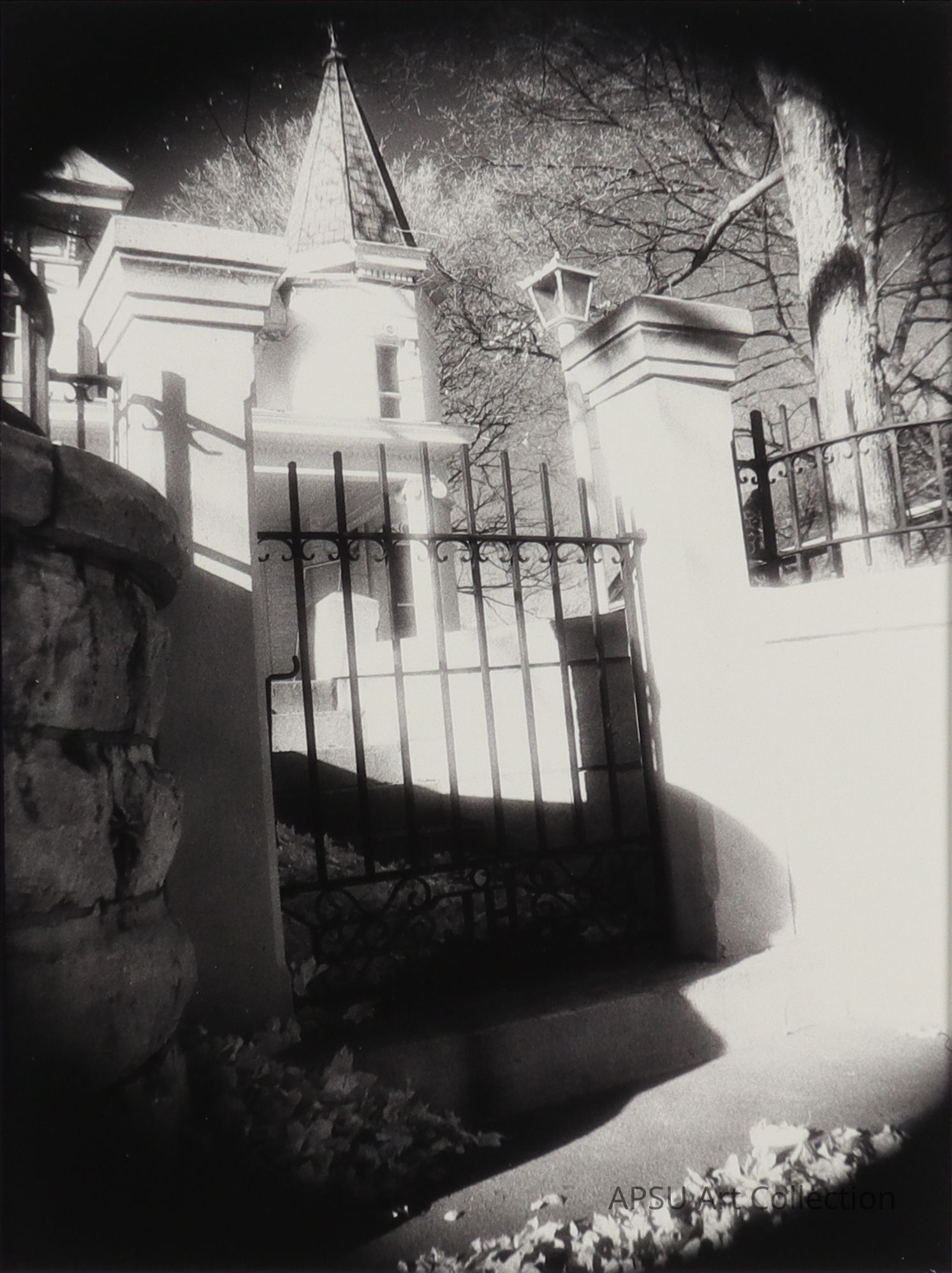 The image depicts a hauntingly atmospheric black-and-white scene of an imposing stone building with towering spires, surrounded by an intricate wrought-iron fence casting shadows onto a dimly lit ground; the structure exudes a sense of mystery and antiquity, enhanced by the stark contrast between light and shadow, while the barren branches of a nearby tree and a solitary lamp post contribute to the eerie, perhaps gothic ambiance that evokes the feeling of a forgotten, perhaps haunted, place where history and stories untold.