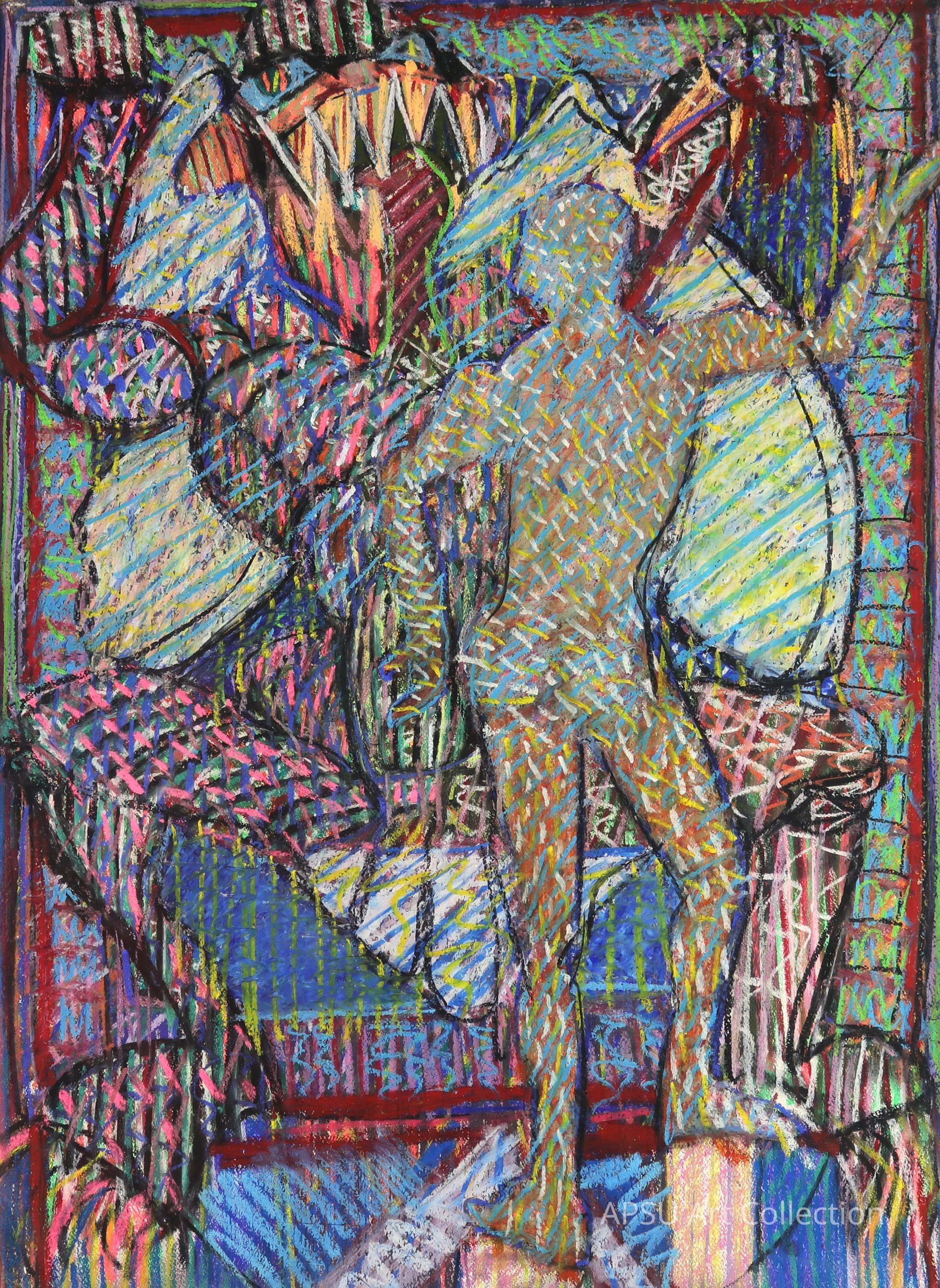 In this vividly colorful and abstract image, a humanoid figure is depicted in the foreground, surrounded by chaotic, intertwining shapes and patterns, rendered in a variety of bright colors like blue, orange, red, and yellow. The bold use of pastels and crisscross patterns creates a sense of movement and dynamism, with the figure seemingly caught in an energetic dance or struggle with the vibrant forms around it. The background is filled with geometric shapes and jagged lines, adding depth and complexity.
