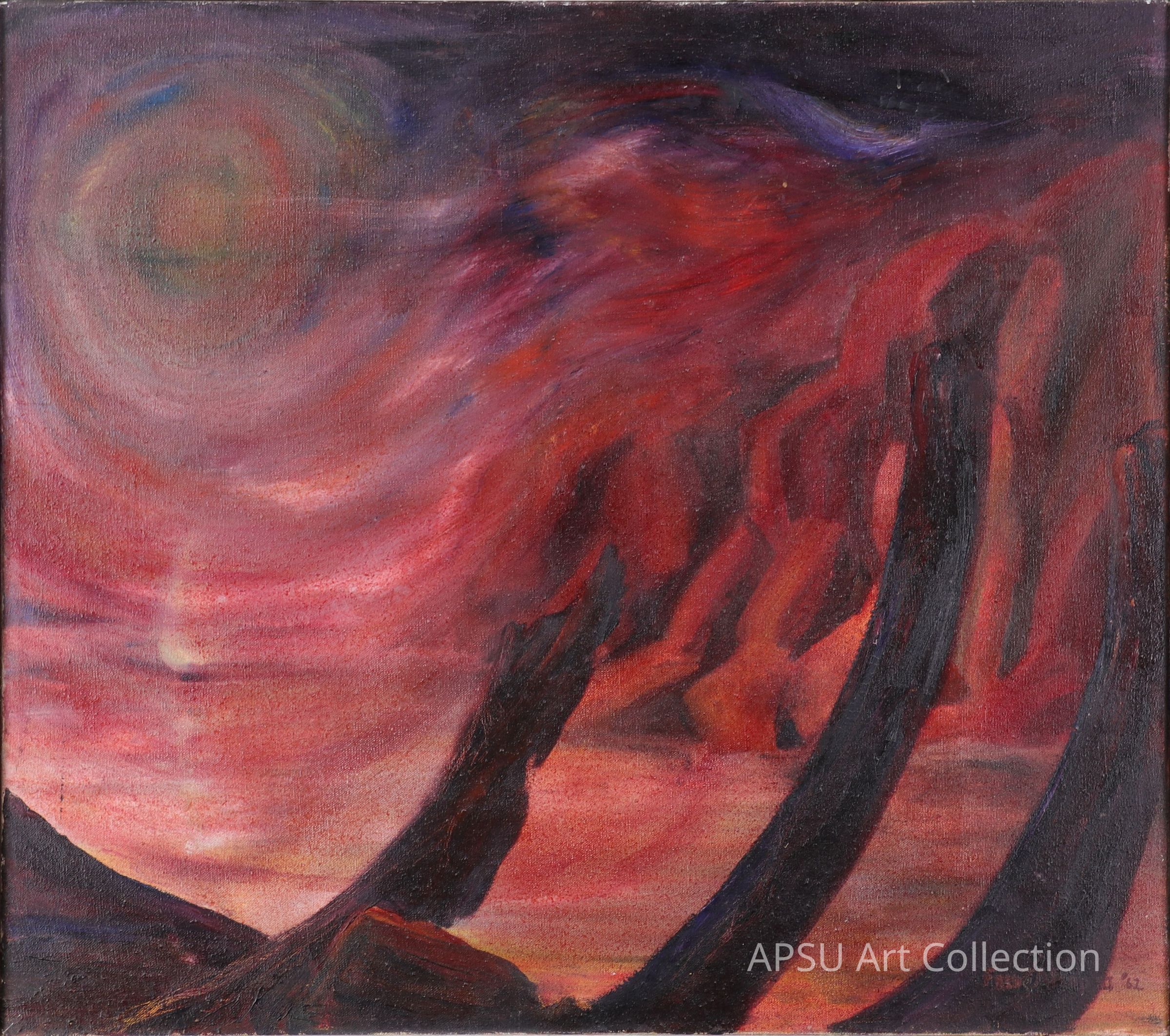 The image depicts an abstract painting filled with deep red and black hues, creating a dramatic and intense atmosphere. The swirling patterns evoke a sense of chaotic energy and movement, as if capturing the raw power of a turbulent storm or cosmic event. In the foreground, there are dark, curved shapes that rise ominously, adding a sense of mystery and depth. The blending of colors creates a fiery appearance, suggesting themes of destruction or transformation.