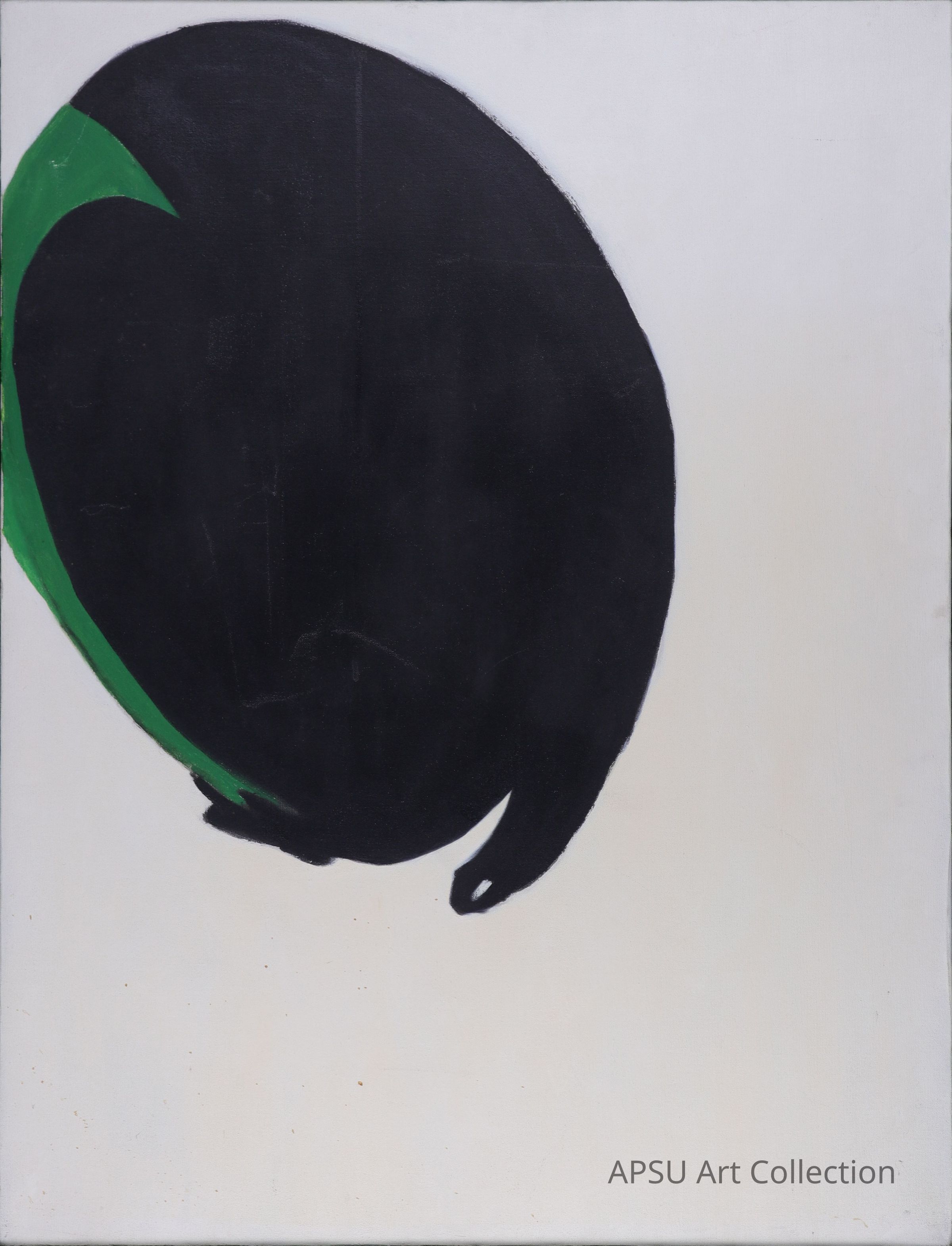 The image features an abstract painting with a large, dark, organic shape dominating the majority of the canvas, set against a muted, tan background. The shape, resembling an irregular, rounded form, is primarily black with hints of deep green along the edges, adding depth and contrast. This composition creates a sense of movement and mystery, inviting viewers to interpret its form and significance.