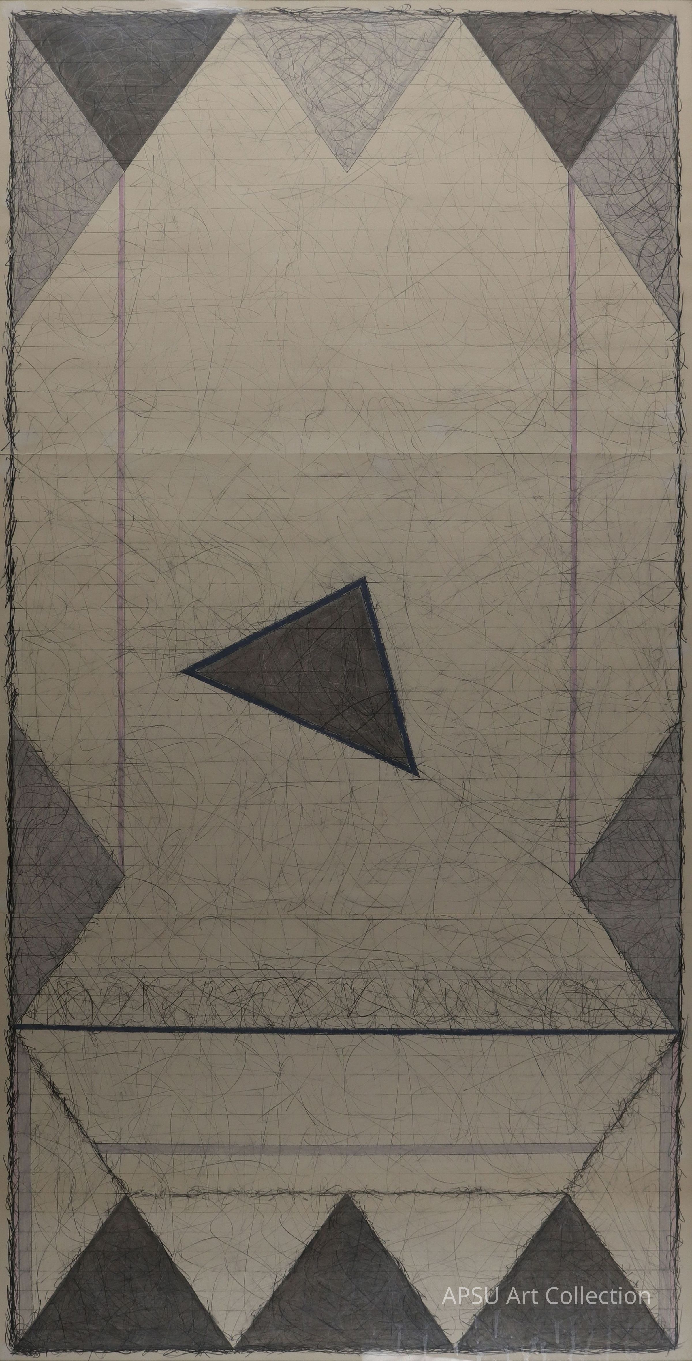 The image displays an abstract framed artwork featuring a large triangular shape in the center, surrounded by intricate linear patterns in varying shades of brown and black. The piece is accentuated by a series of symmetrical triangular forms positioned along the edges, creating a dynamic and geometric composition. The texture of the background gives the appearance of a detailed map or a network of lines, adding depth and complexity to the piece. The overall aesthetic conveys a sense of both order and chaos.