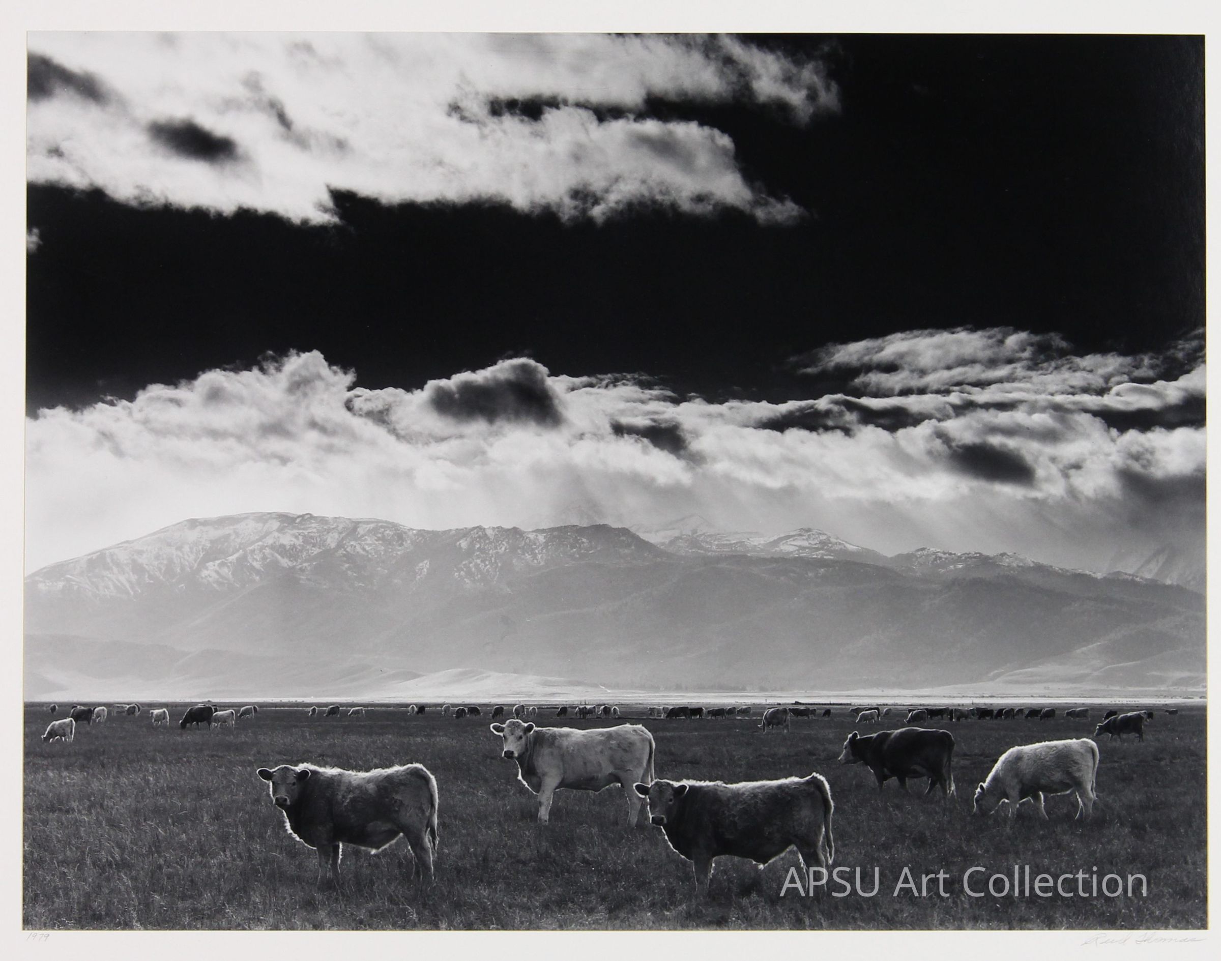 Black and white photograph of grazing cows whose backs are accentuated with bright light. Mountains are in the background of the field. Three cows make eye contact in the foreground.Collection