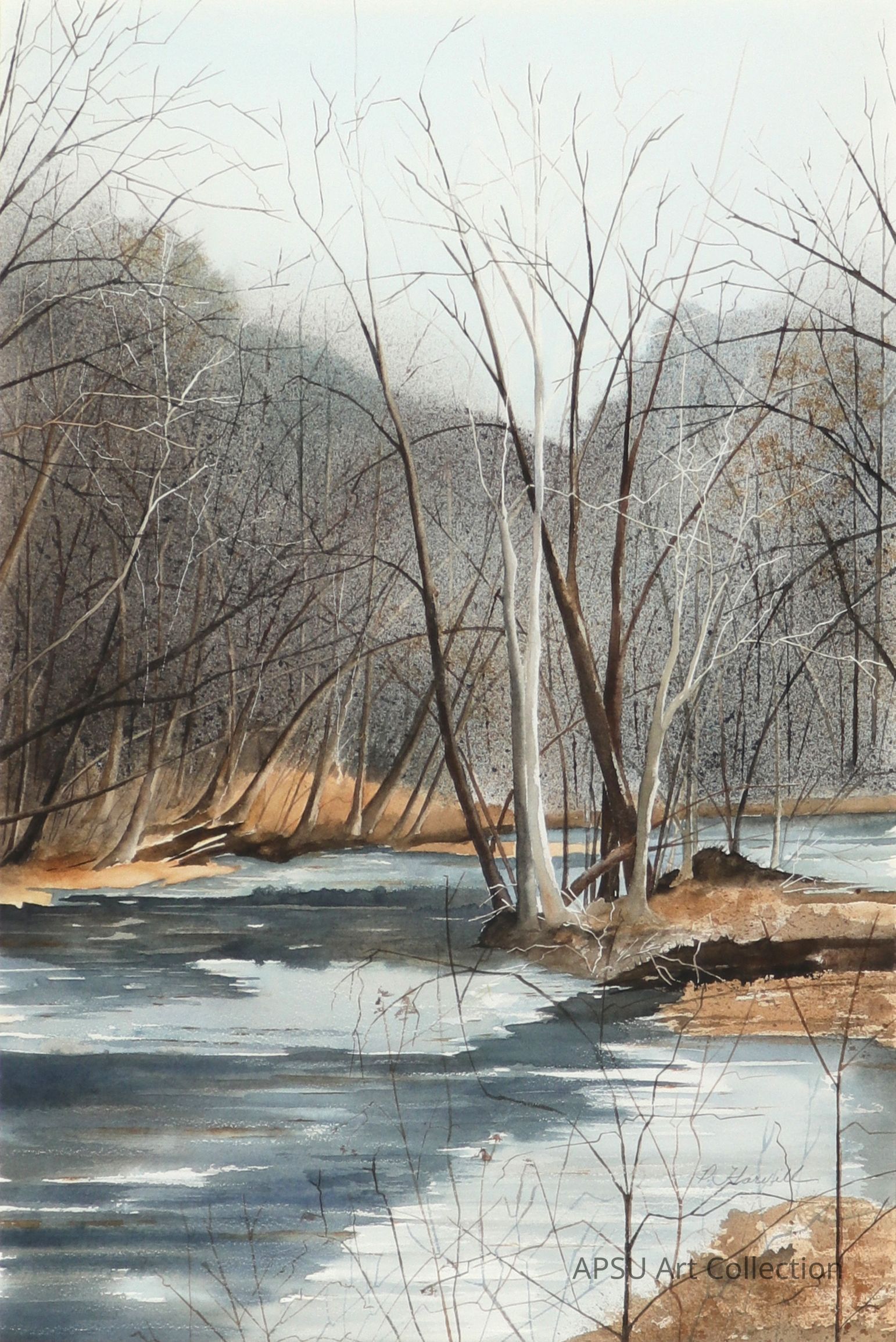 A landscape watercolor painting of a nature river scene in the winterType of Painting