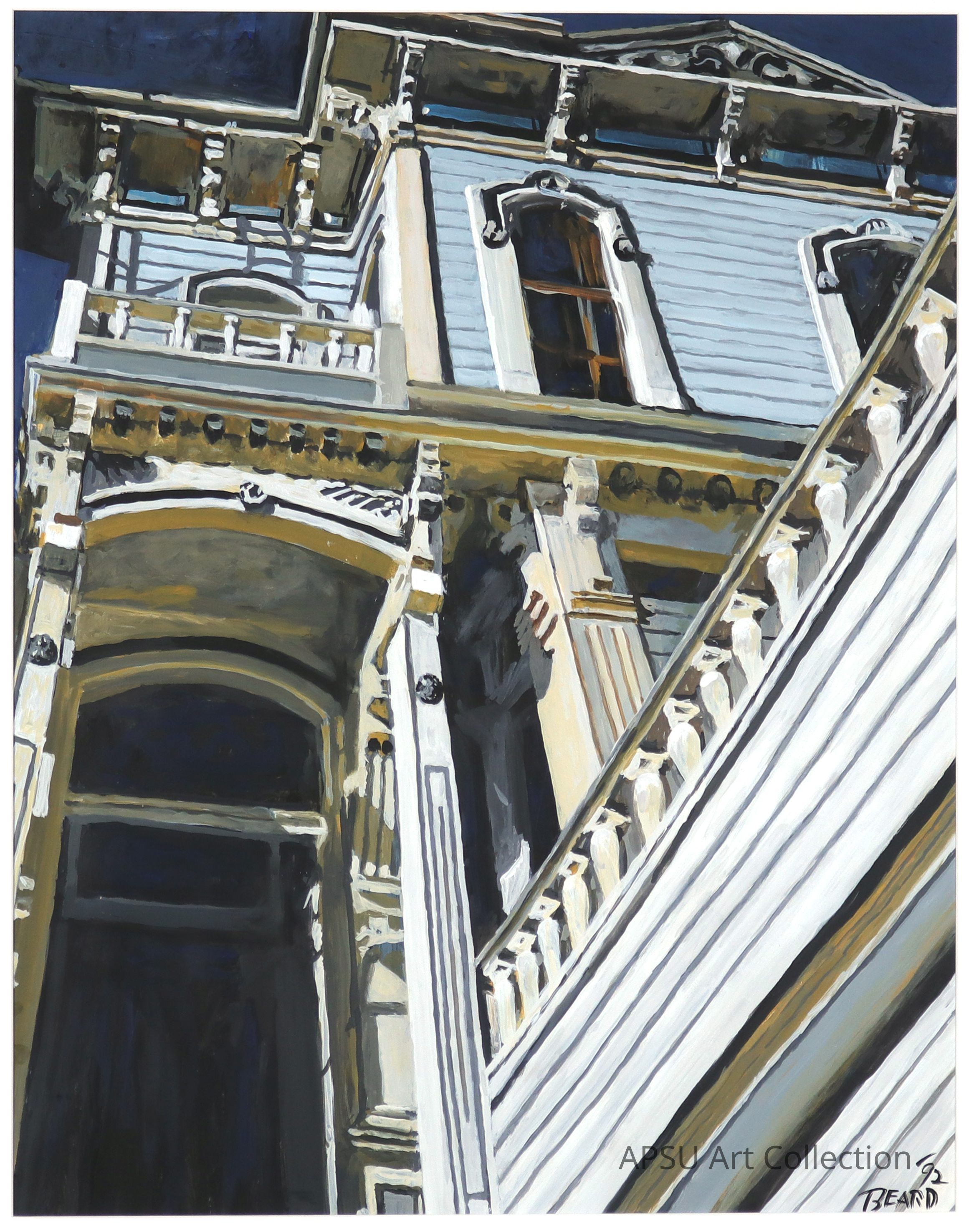 The image is a painting depicting an upward view of an ornate, historic building, showcasing its intricate architectural details. The structure features decorative columns, carved moldings, and elaborate window frames that convey a sense of grandeur and elegance. The light blue facade contrasts with the dark background, highlighting the elaborate craftsmanship of the design. The play of light and shadow across the building's surface adds depth and dimension to the composition, while the angle of the perspective emphasizes the verticality and imposing presence of the architecture.