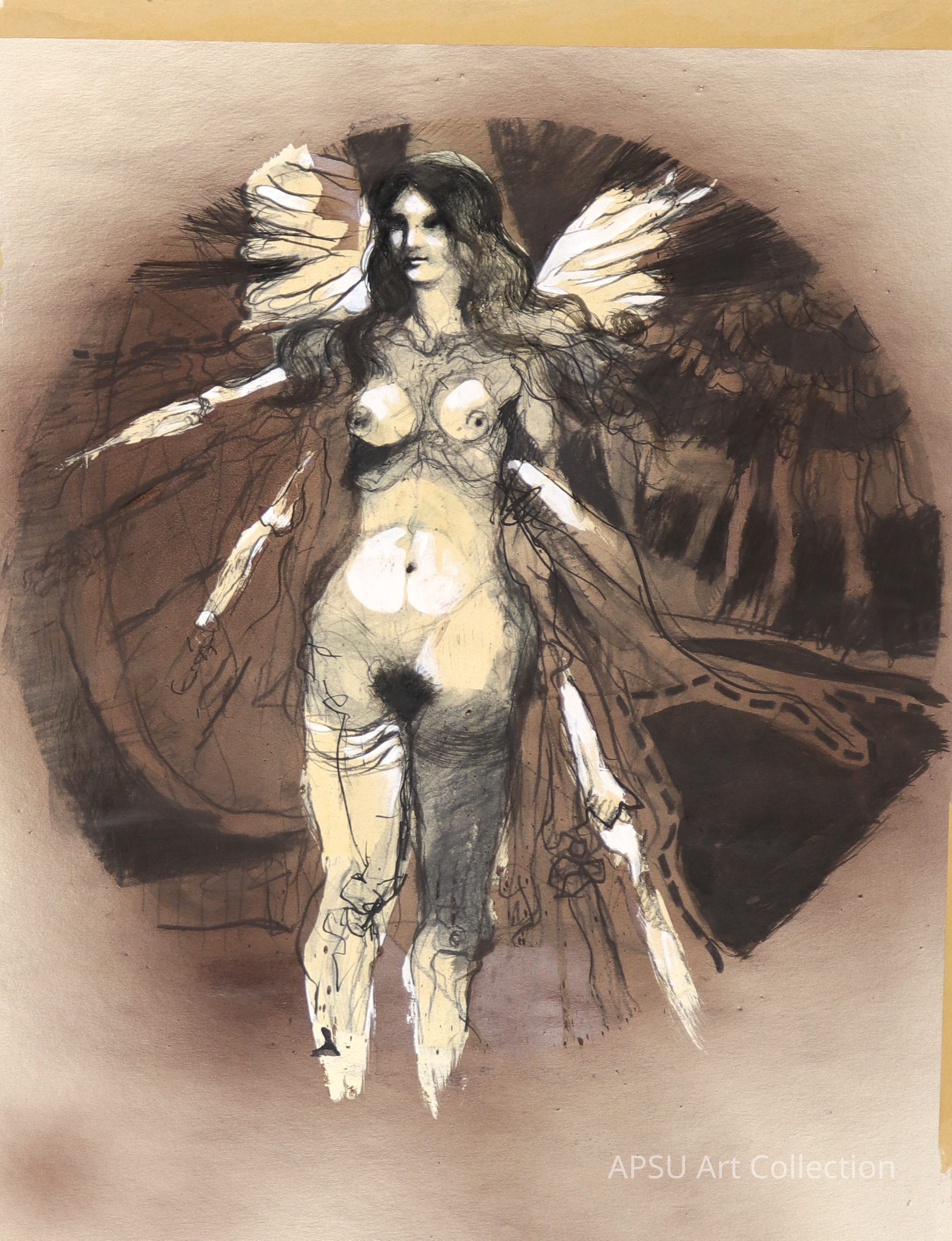 Image of Demeter Ascending. Graphite and Ink, use of lights and dark to create dynamic impression of Demeter, Greek Goddess of Harvest. In Greek mythology Demeter also presides over the cycle of life and death.