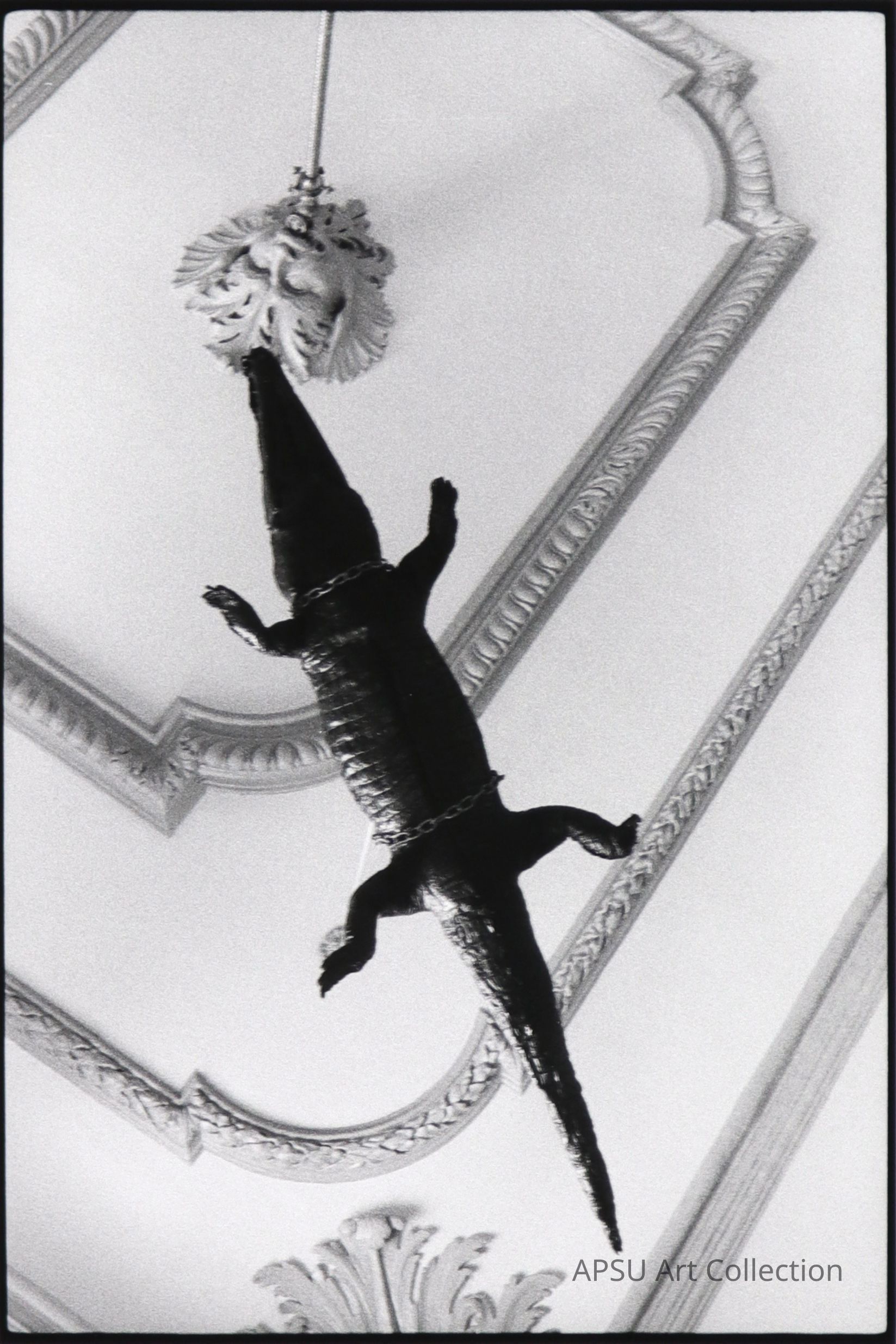 Black and white photograph of an alligator/crocodile hanging by chains from a ceiling that is ornately decoratedCollection