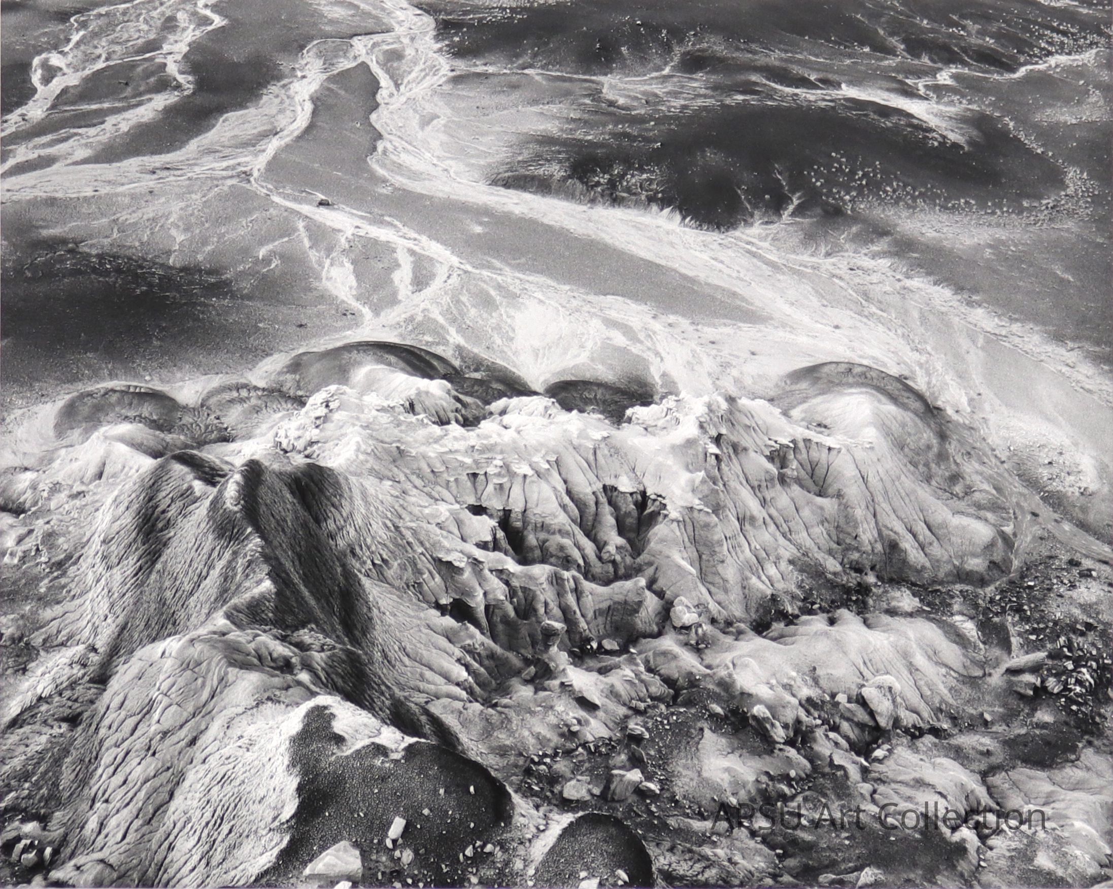 Black and white photograph of rocky scenery that looks like it is by a beach or some source of water, no actual trees are in the photographCollection