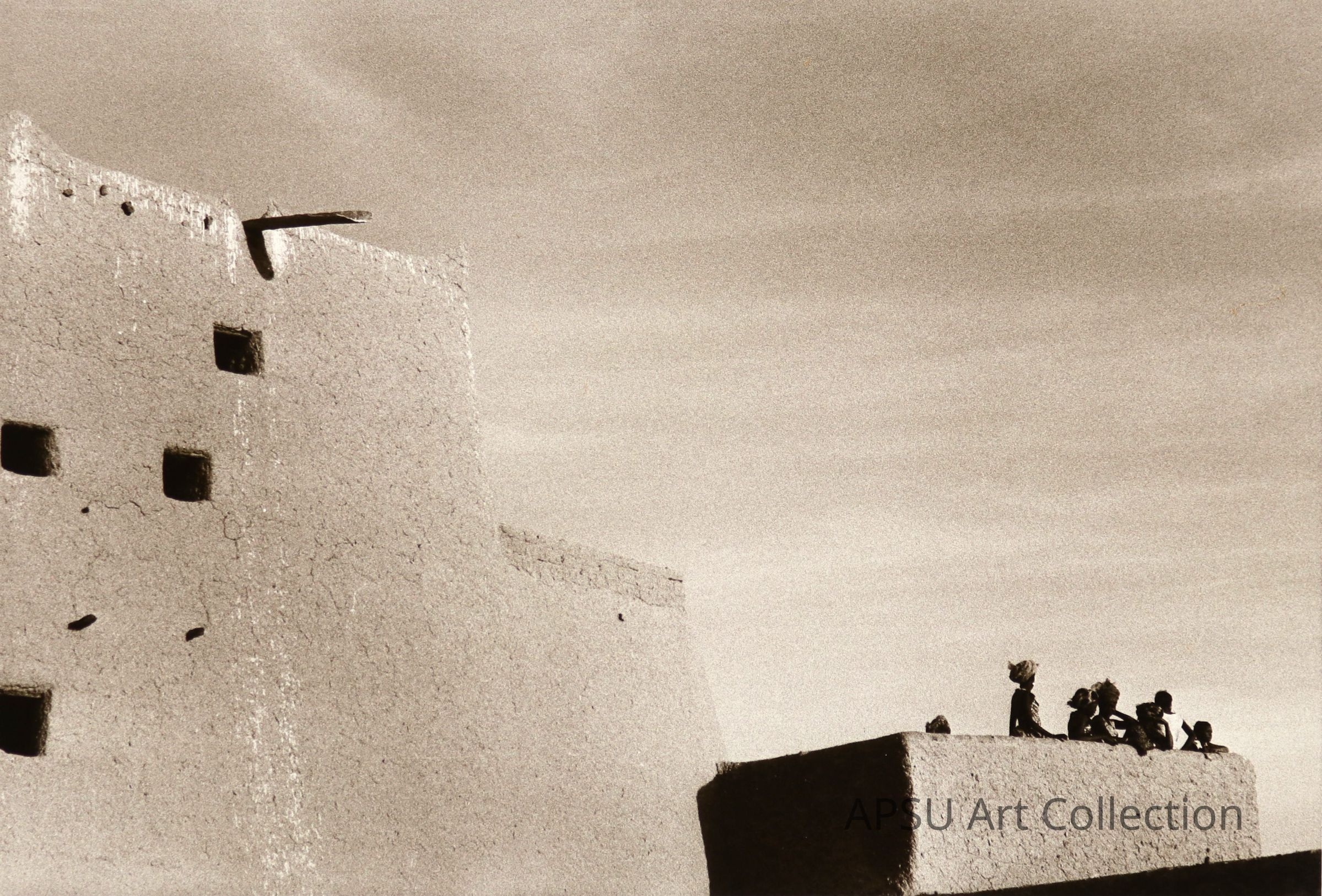 Sepia toned photograph of some people standing on a wall/building in Niger, AfricaCollection
