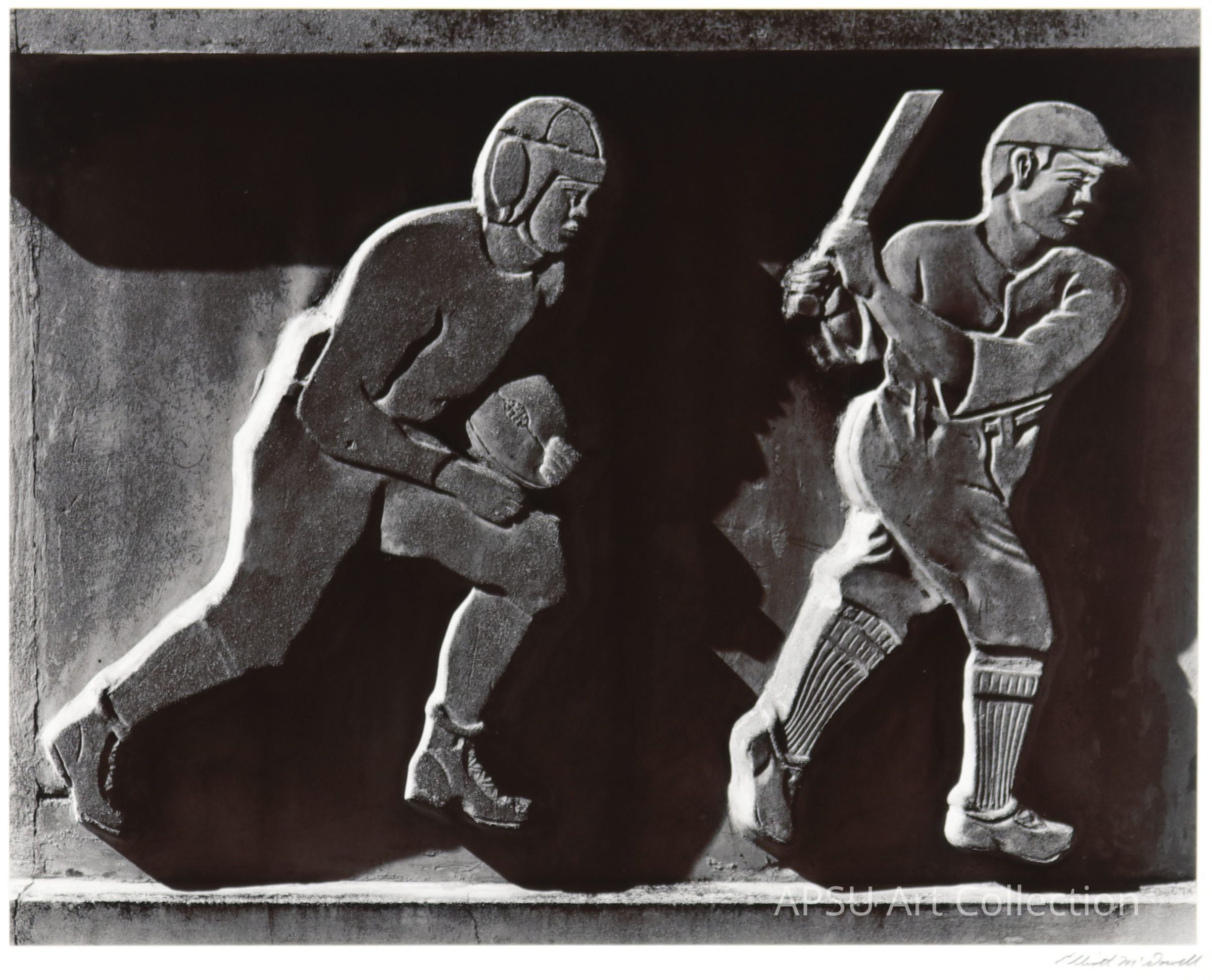 Black and white photograph of a stone relief of a football player and a baseball playerCollection