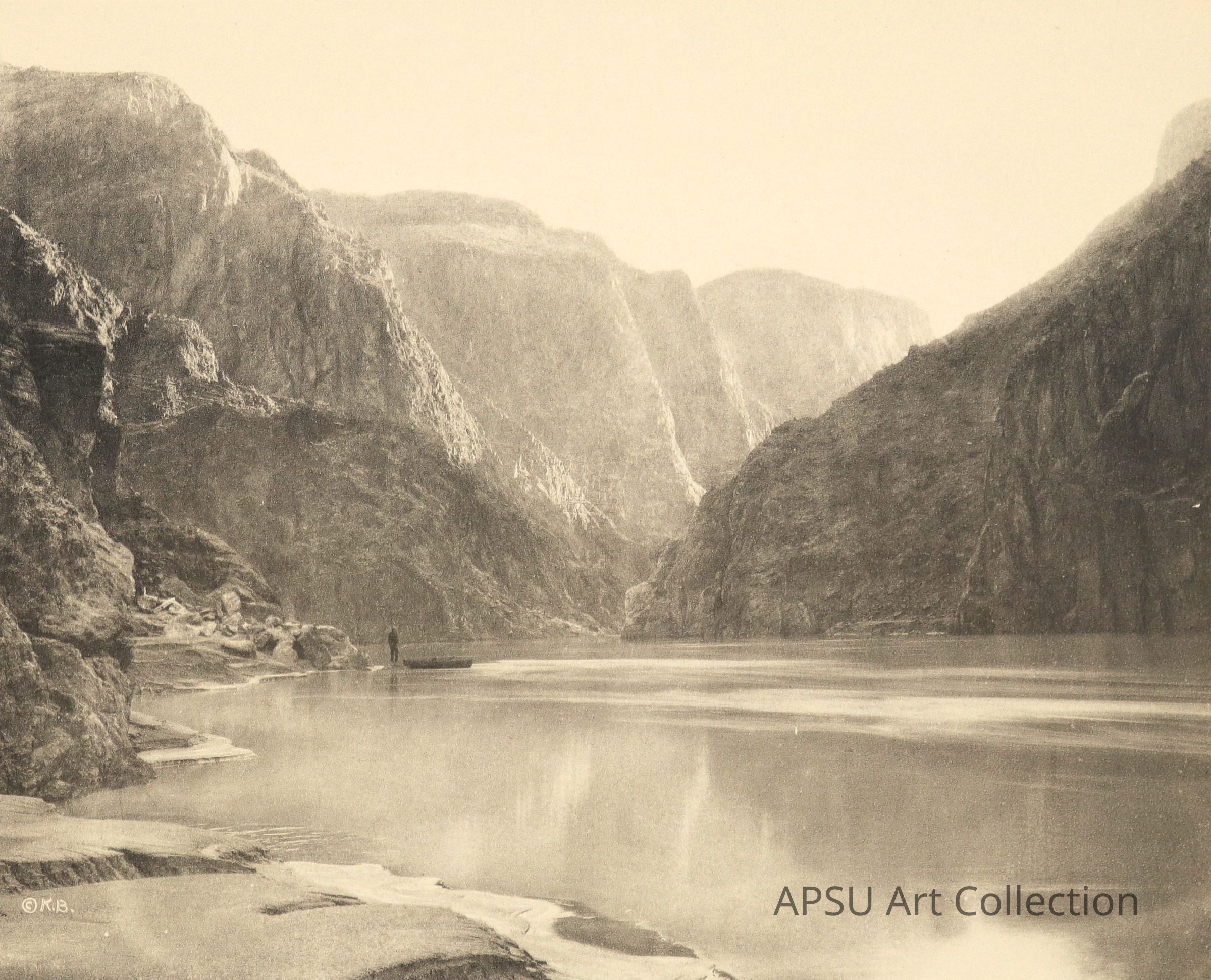 Black and white photograph of a lake/river at the bottom of a canyon. There is a small boat and one man in the photograph.