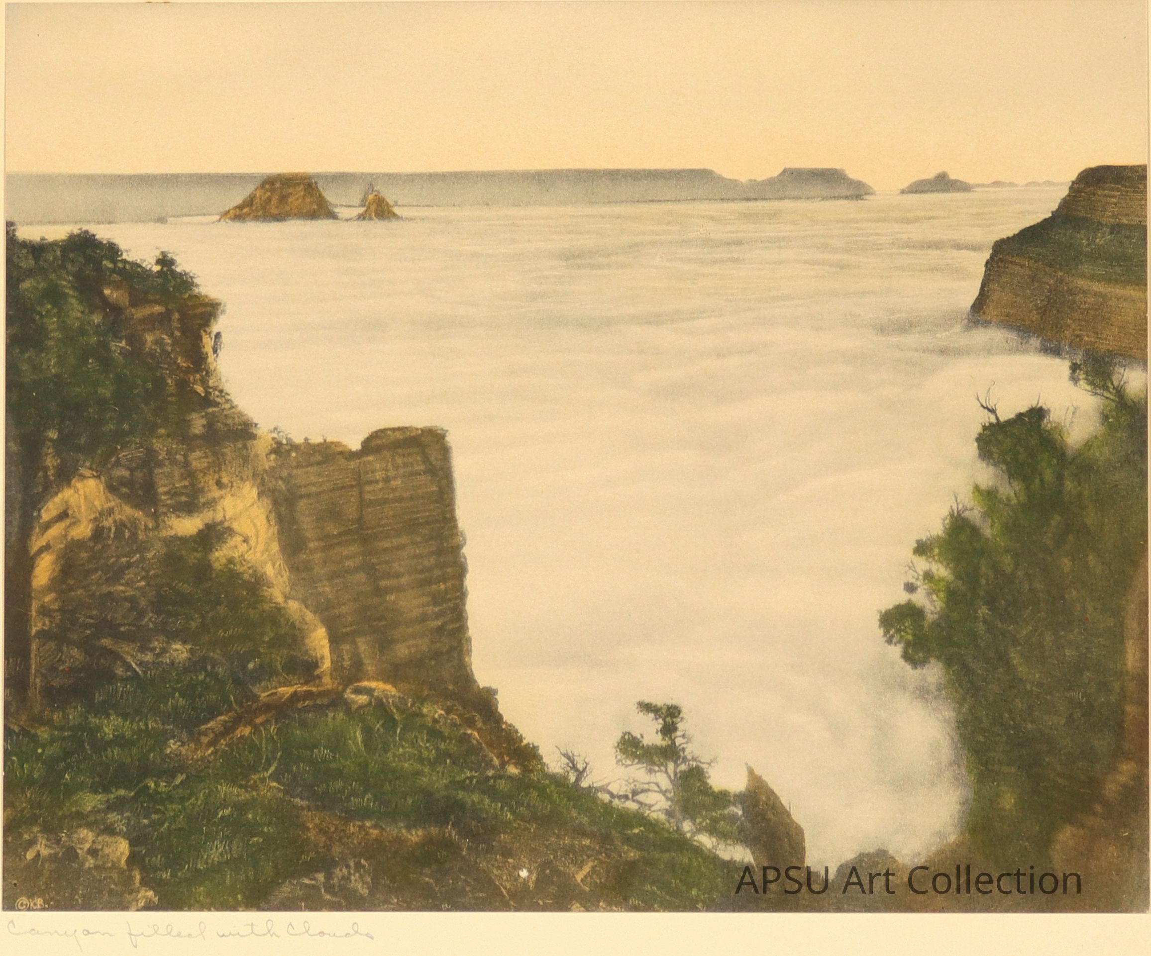 Possibly a lithographic print based on a photograph taken by the Kolb brothers, very similar to colored pencil. There is a canyon filled with cloudsType of Print