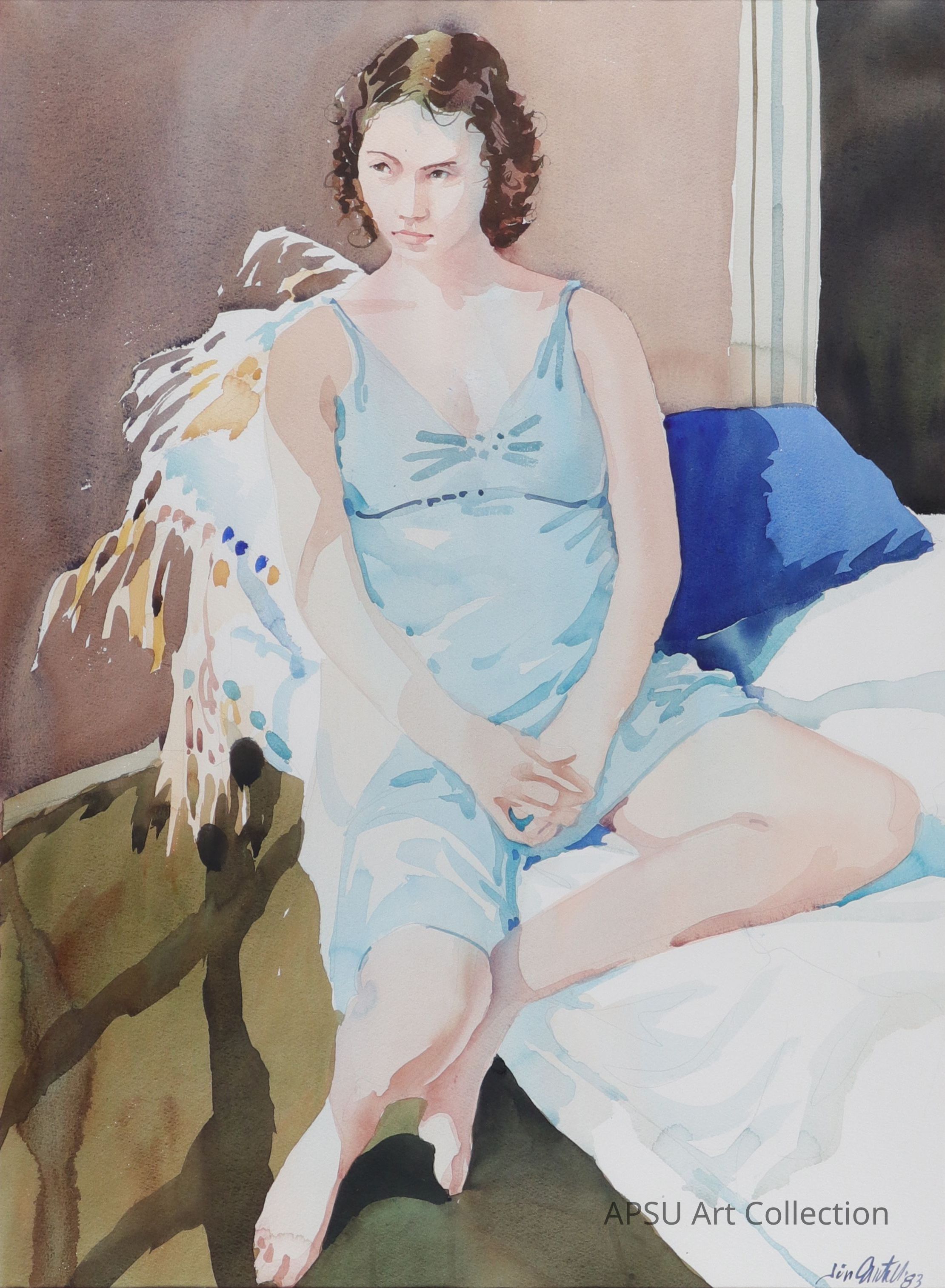 Girl in a blue gown sitting on a bedType of Painting