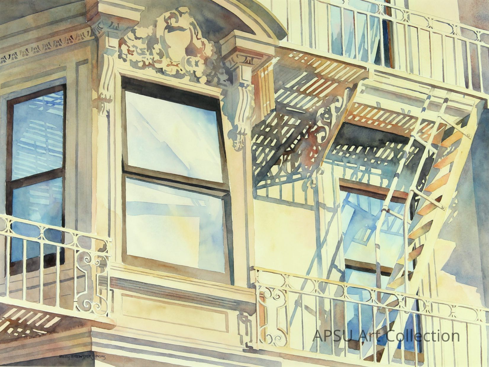 Watercolor painting of a fire escape on the side of a San Francisco apartment