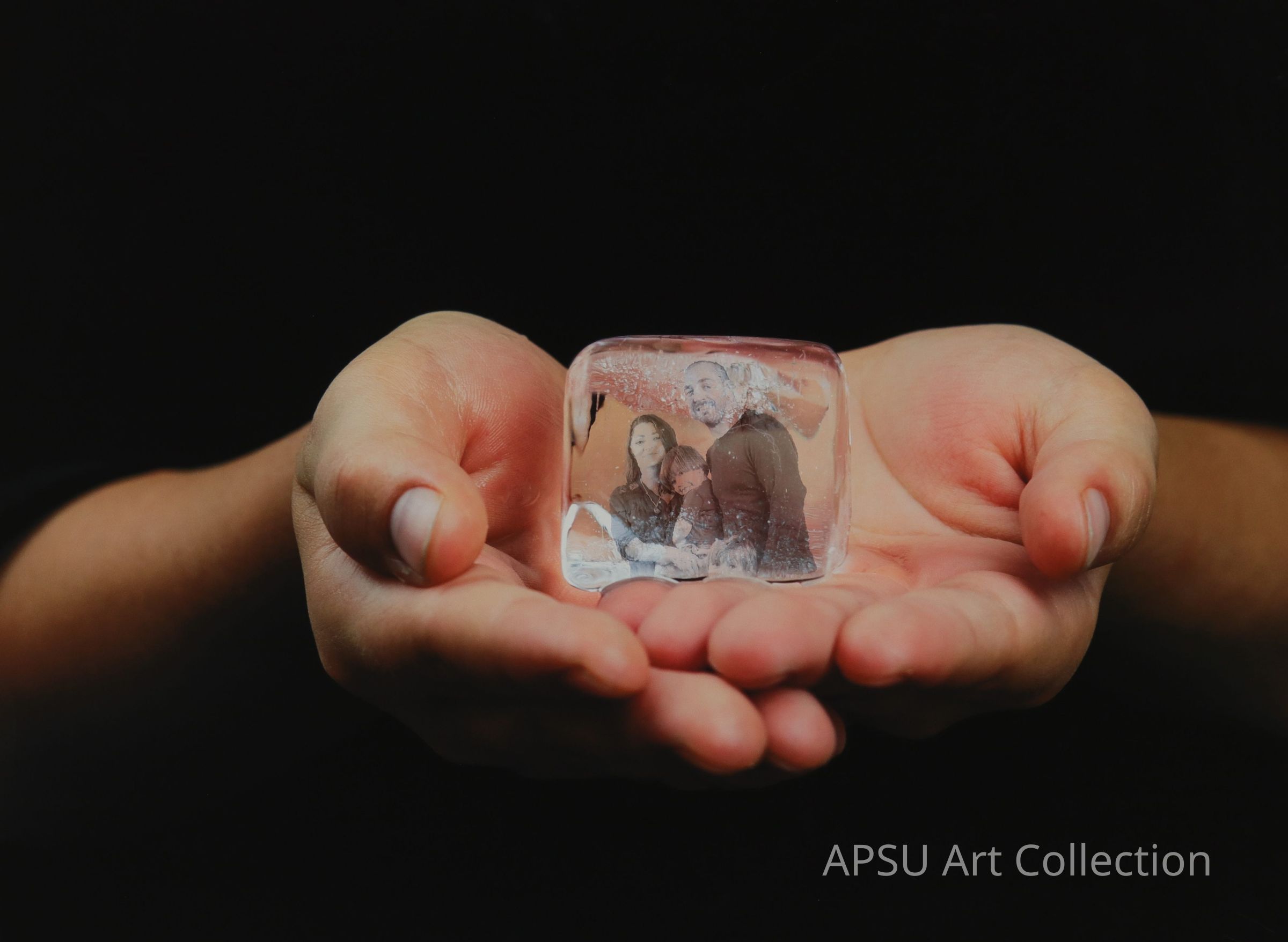 In this striking image, a pair of hands carefully cradle a transparent ice cube, ingeniously embedding a photo of a smiling couple, creating a literal and metaphorical portrayal of preserving memories in a solid but ephemeral medium. The black background accentuates the glowing luminescence of the cube and the image within, symbolizing fragility and the transient nature of moments captured in time. The ice has started to melt.