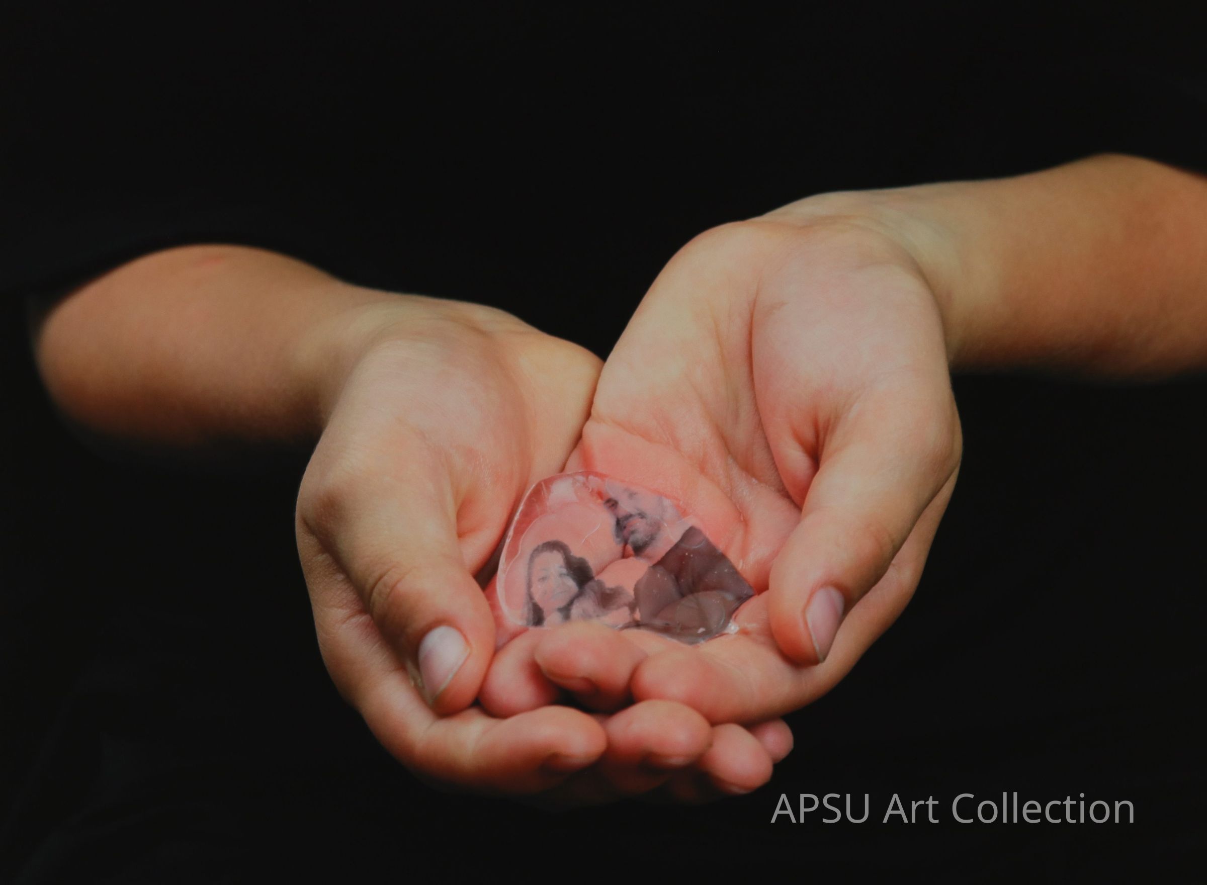 In the image, a person's hands are gently cupping a melting ice cube that contains a photograph of a man and a woman together, set against a stark black background, highlighting the poignant sense of memory or tribute represented by the photograph.