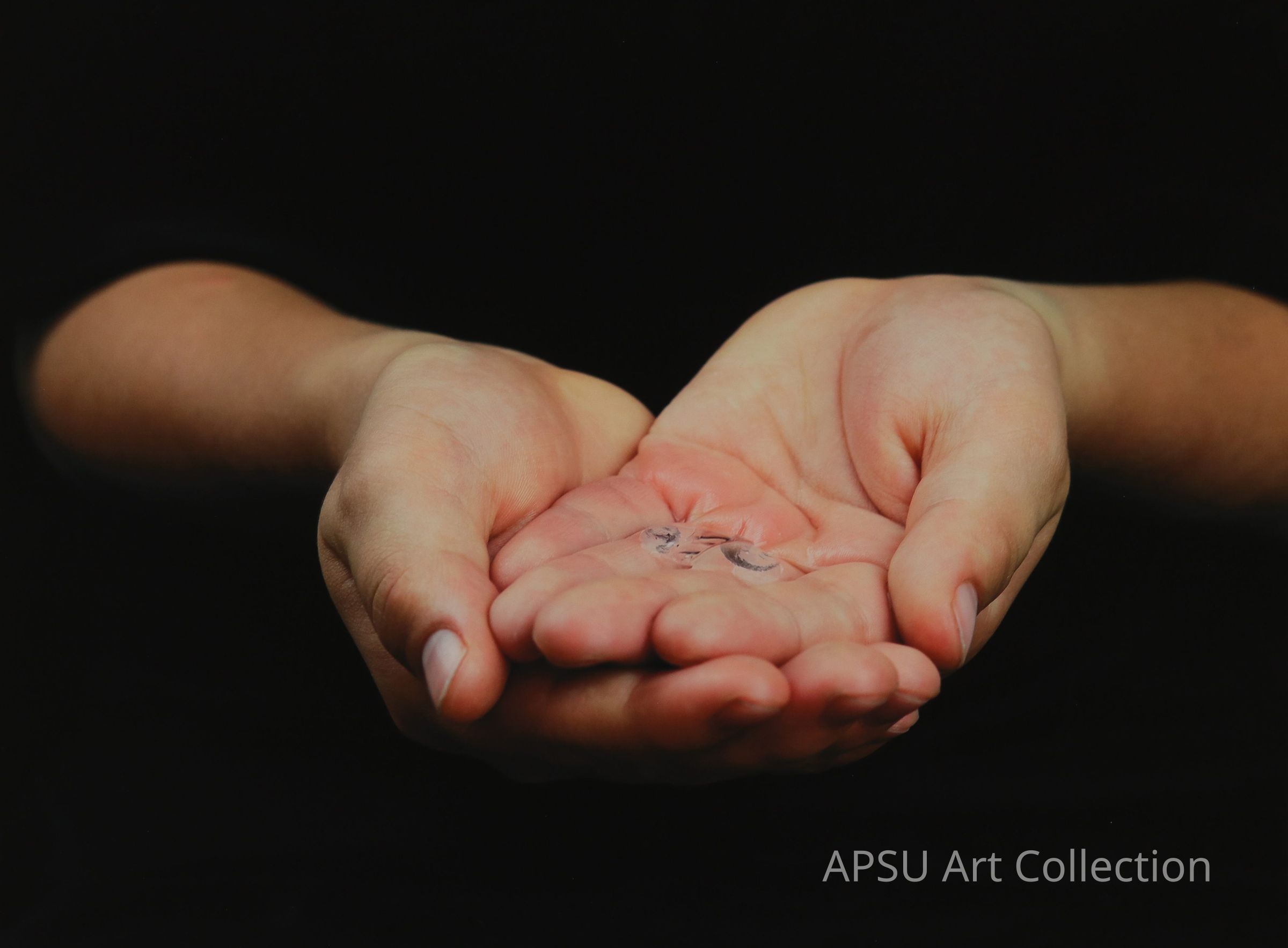 The image presents a pair of gently cupped human hands open against a stark black background, delicately holding a completely melted ice cube, or puddle of water with a distorted image of a family inside.