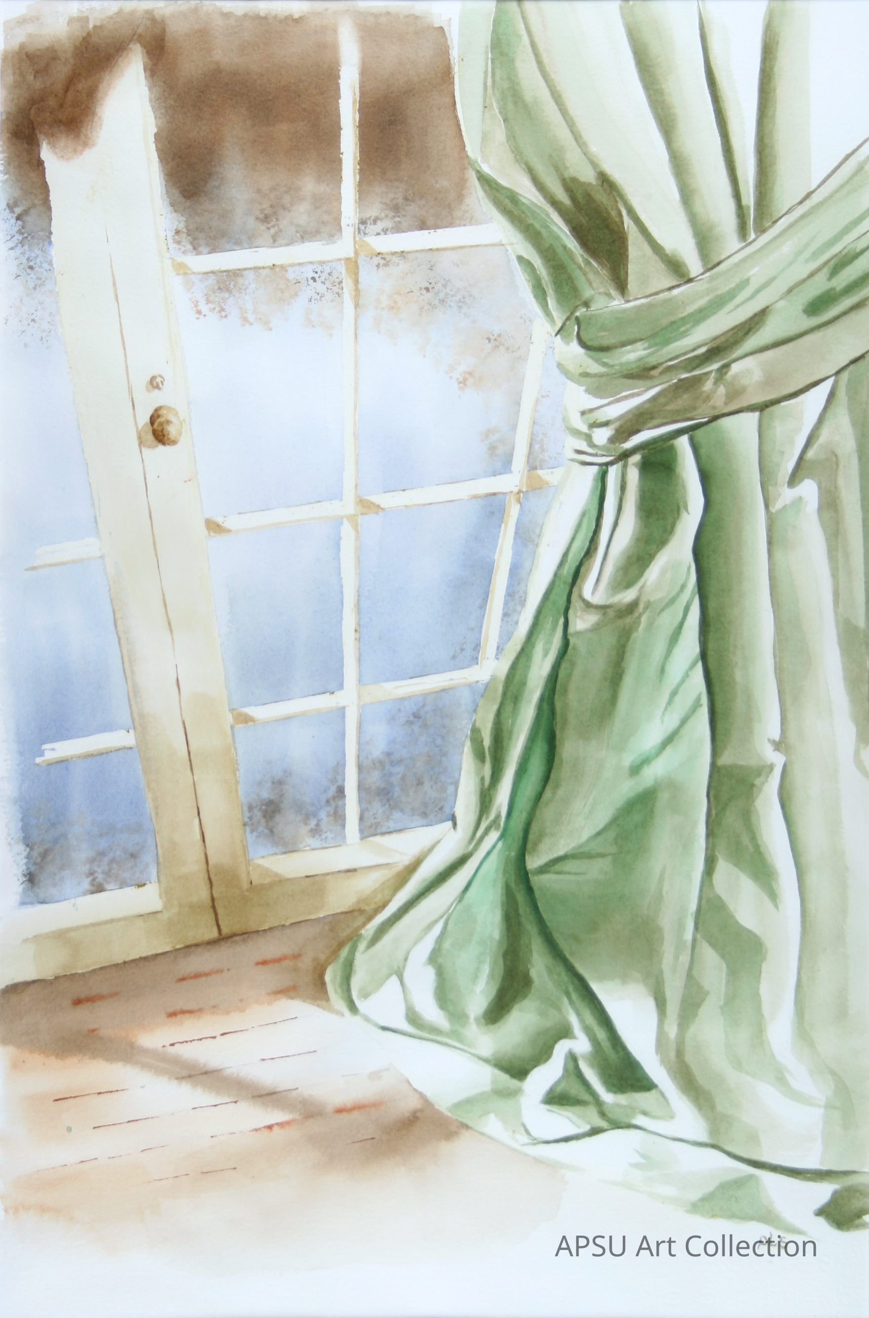 Bird's eye view point of wood floors, white french doors, and a green curtain in watercolor.