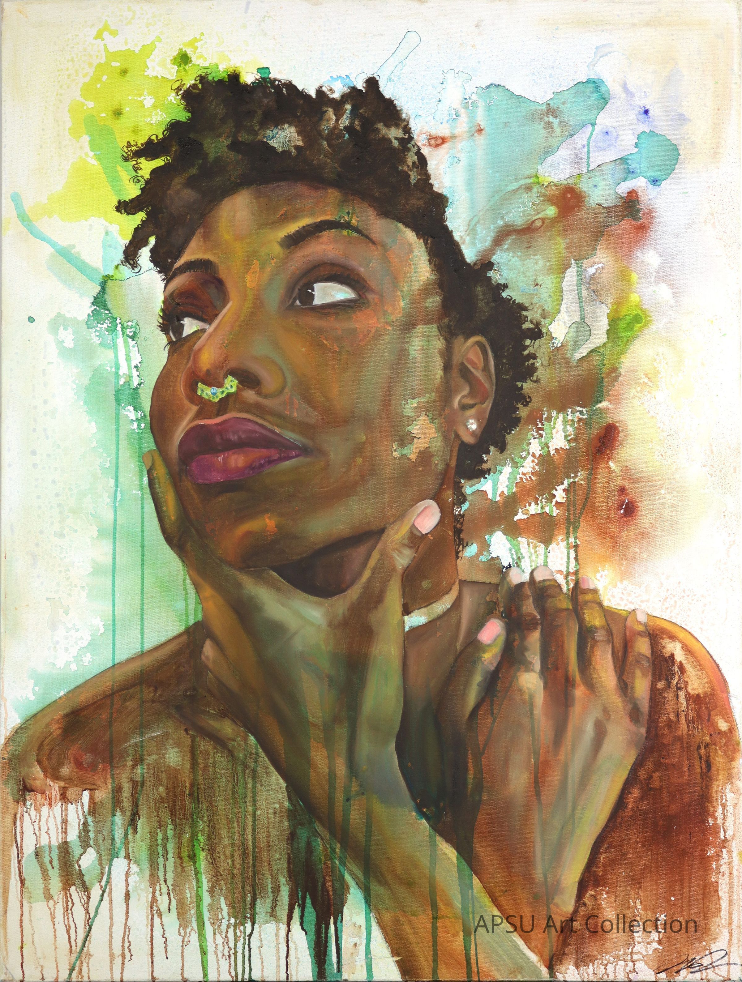 This artwork showcases a striking portrait of an individual with an expressive gaze, surrounded by vibrant splashes of color that seamlessly blend into the background, creating an ethereal effect. The person, with short curly hair and a serene expression, is depicted in a contemplative pose, hands gently touching the face, which adds a layer of introspection and emotion. The use of earthy tones and fluid, dripping paint techniques give the piece a dynamic yet harmonious feel, reflecting strength and vulnerability.