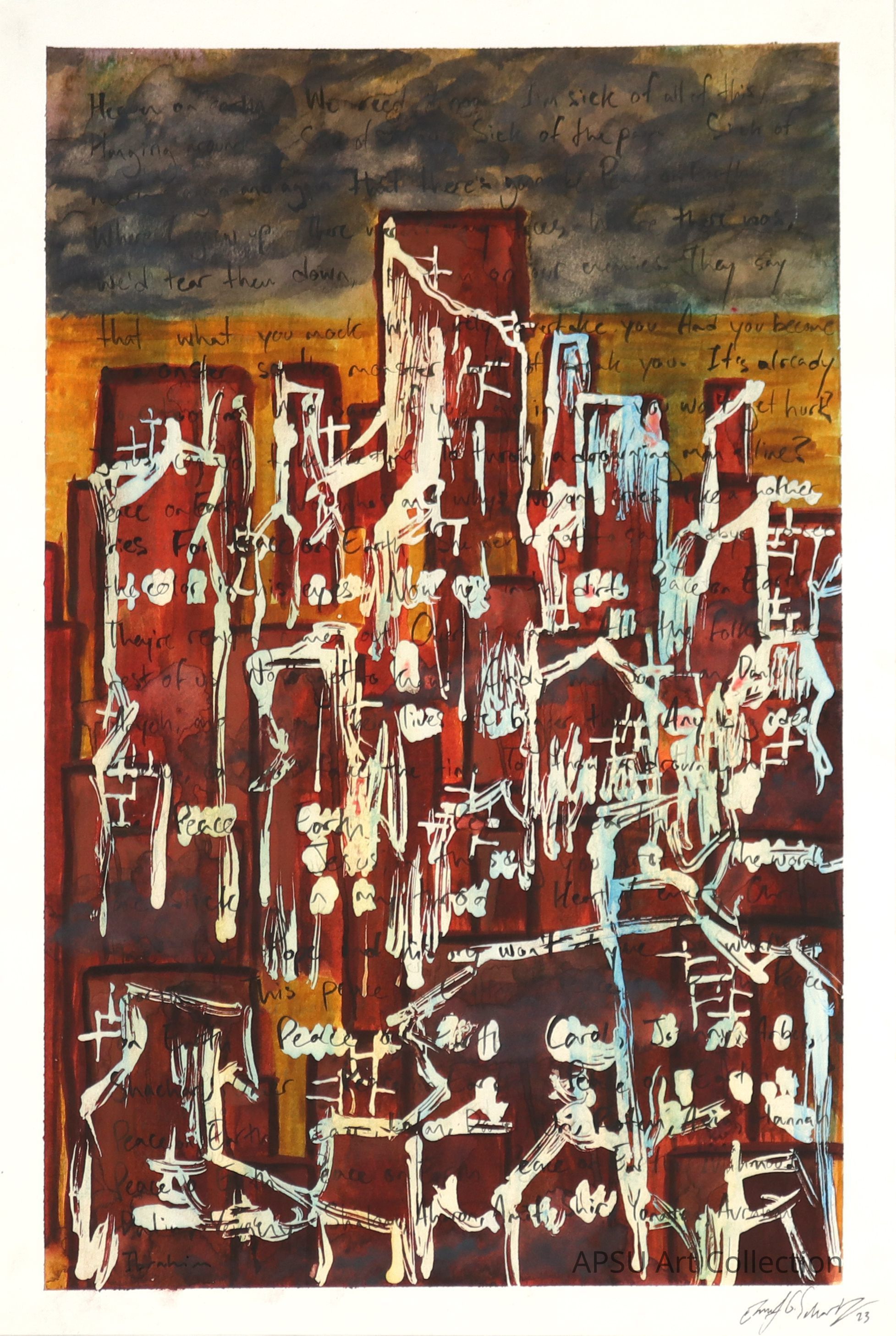 'Lament' is a browned city scape, abstractly described in red's, brown's and white's, the background is a dark cloud of deep brown tones and black writing scrawled in cursive covers the whole of the image. White shapes seem to crawl about the buildings as dripping paint that curves the abstract ideas of the skycrapers in the image.Type of Painting