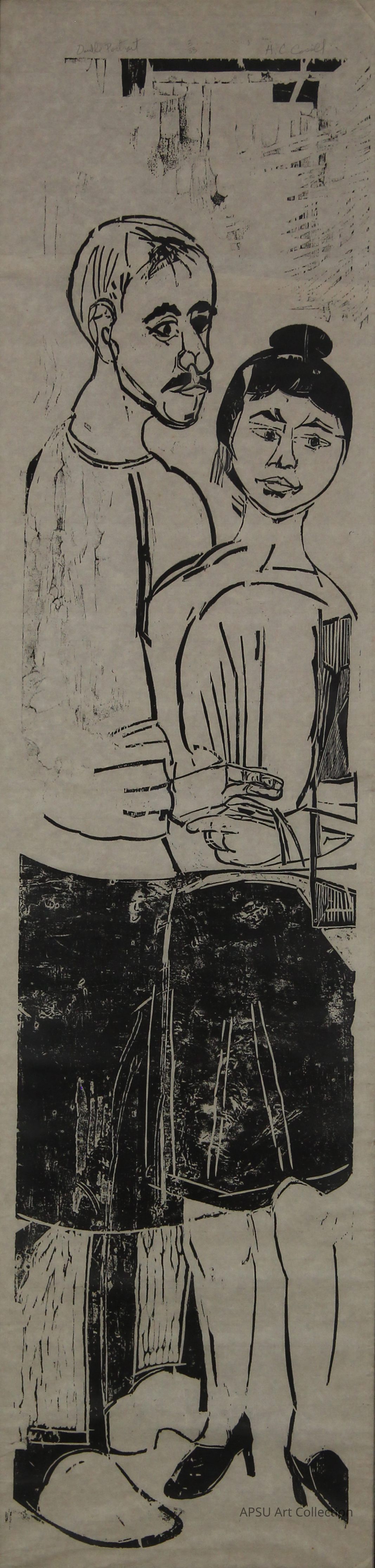 ed. 2/35, Woodcut print of two standing figures.Type of Print