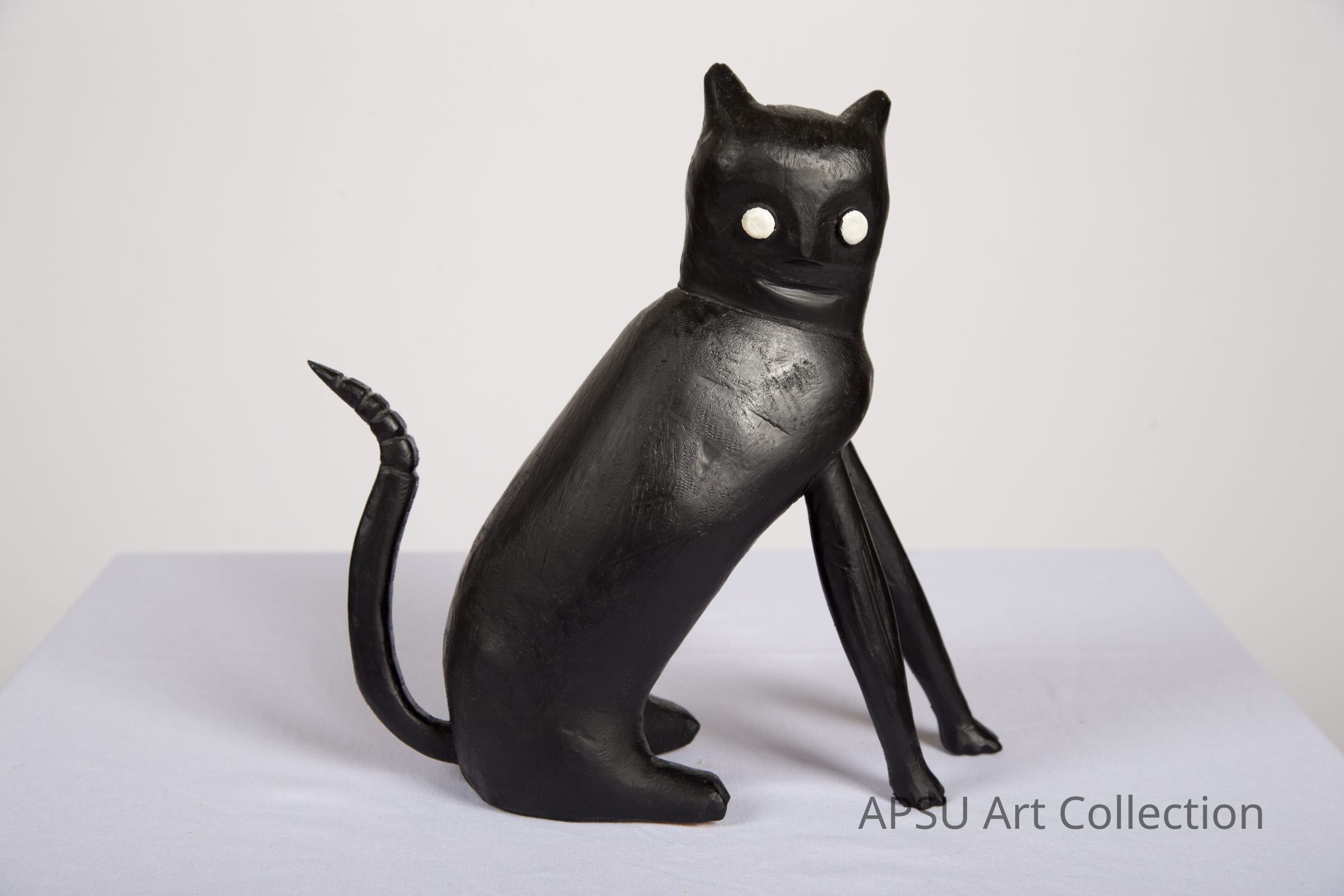 The image features a sculpture of a stylized black cat with large, piercing white eyes, standing upright on its hind legs while supporting itself with one front paw. The cat's tail curls upwards, and the surface texture of the sculpture appears smooth and glossy, rendering the art piece with a mysterious and cartoonish charm set against a plain white background.