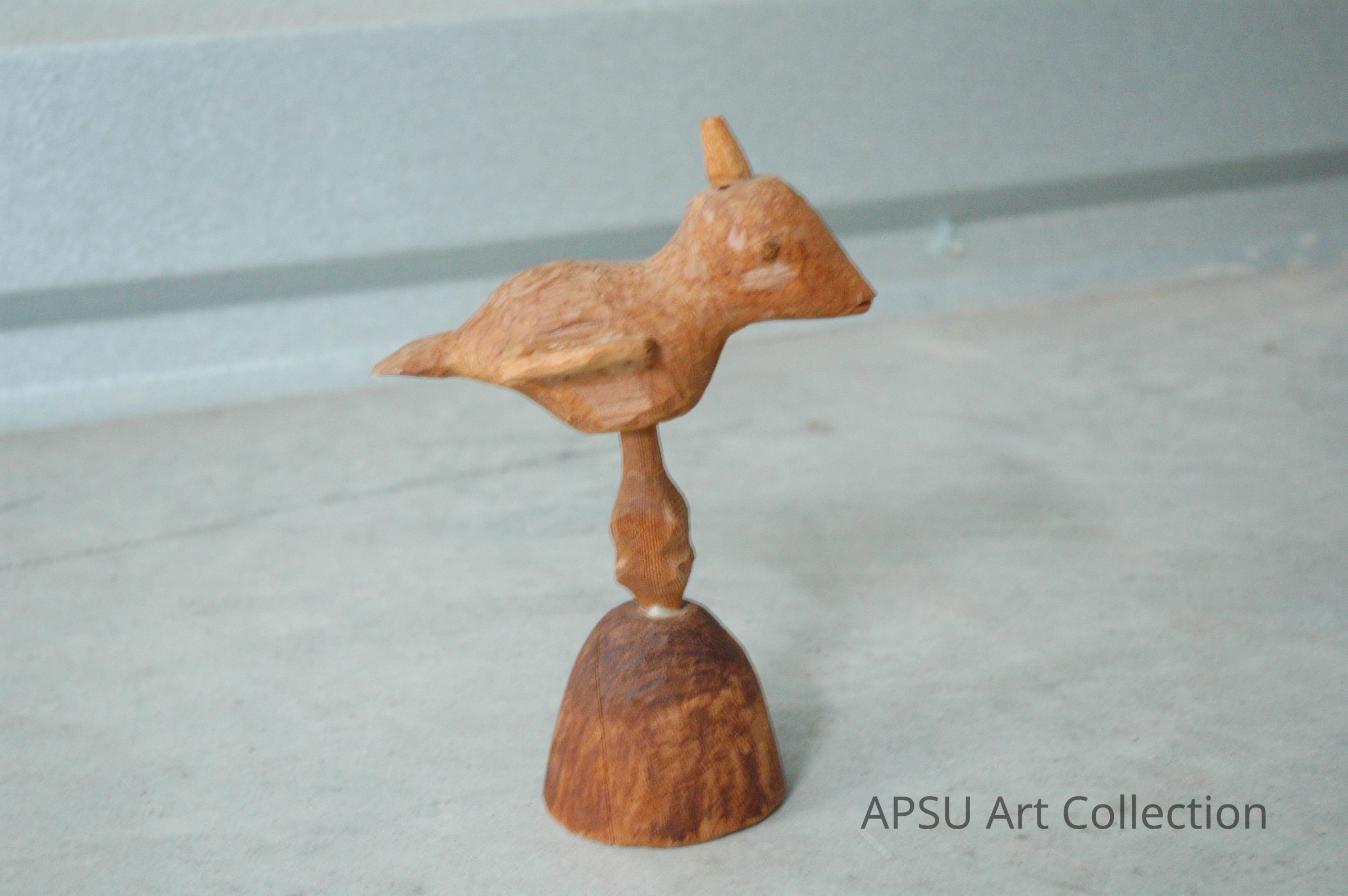 The image captures a wooden sculpture of a bird gracefully poised on a slender stand, skillfully carved with attention to the details of its features, perched atop a rounded base, all set against a simplistic background that enhances its rustic charm.