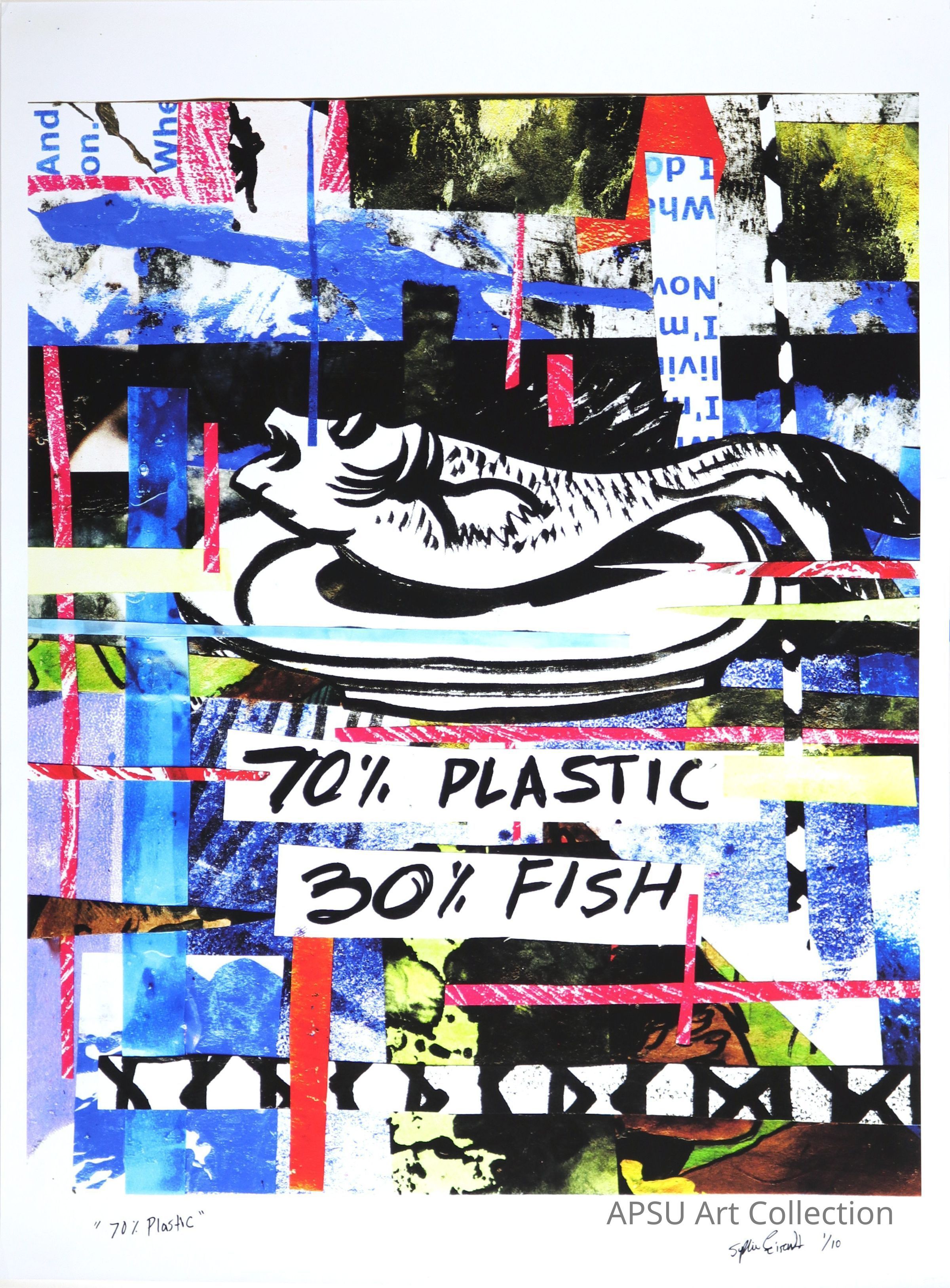 Inkjet print, colorful, has a fish and words that say 70% Plastic 30% Fish. 1/10Type of Print
