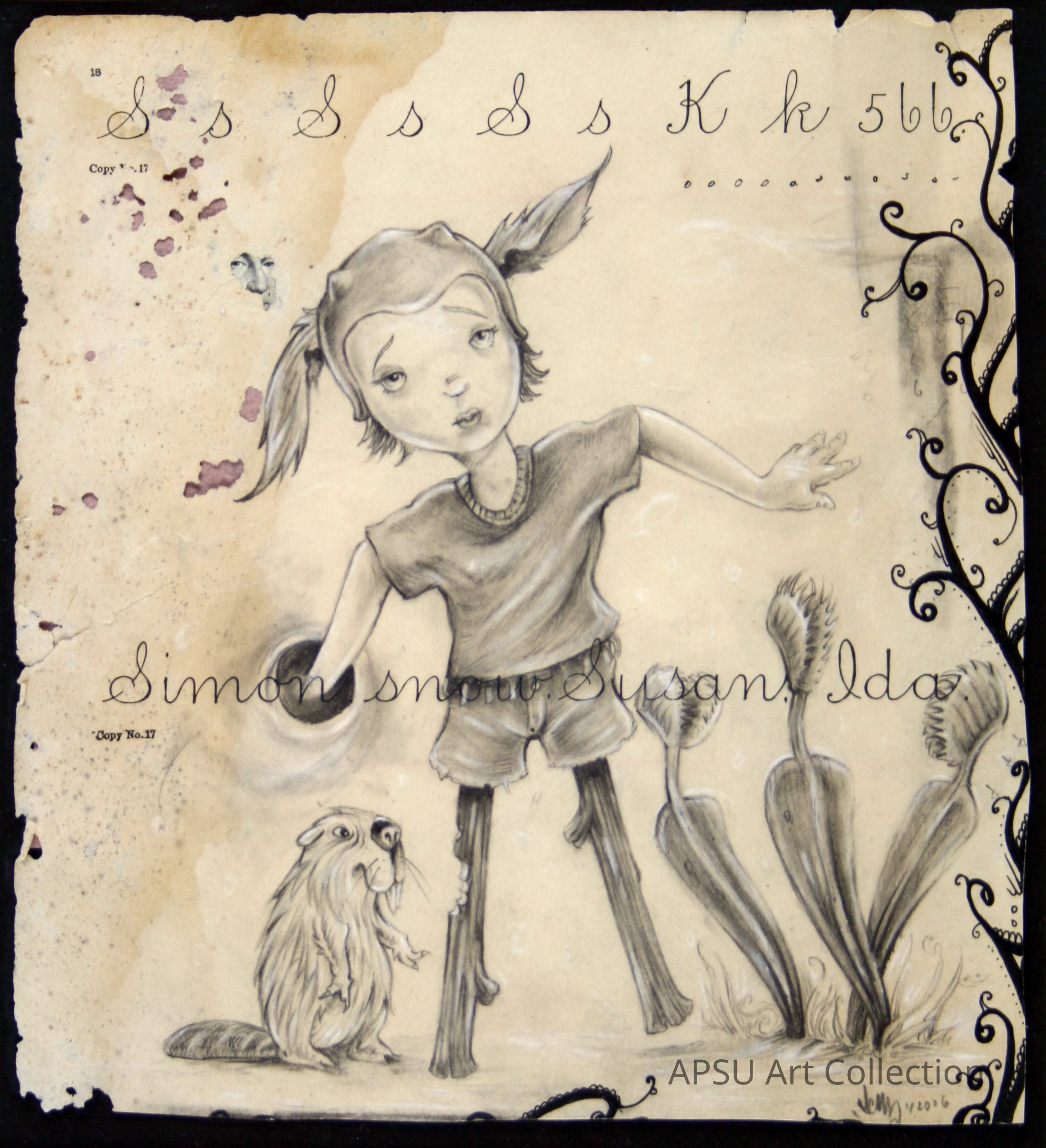 Drawing on reclaimed paper of a female figure with wooden legs, a beaver having taken a bit of one of the wooden legs, and three venus fly traps. Drawing is mounted on black boardType of Drawing