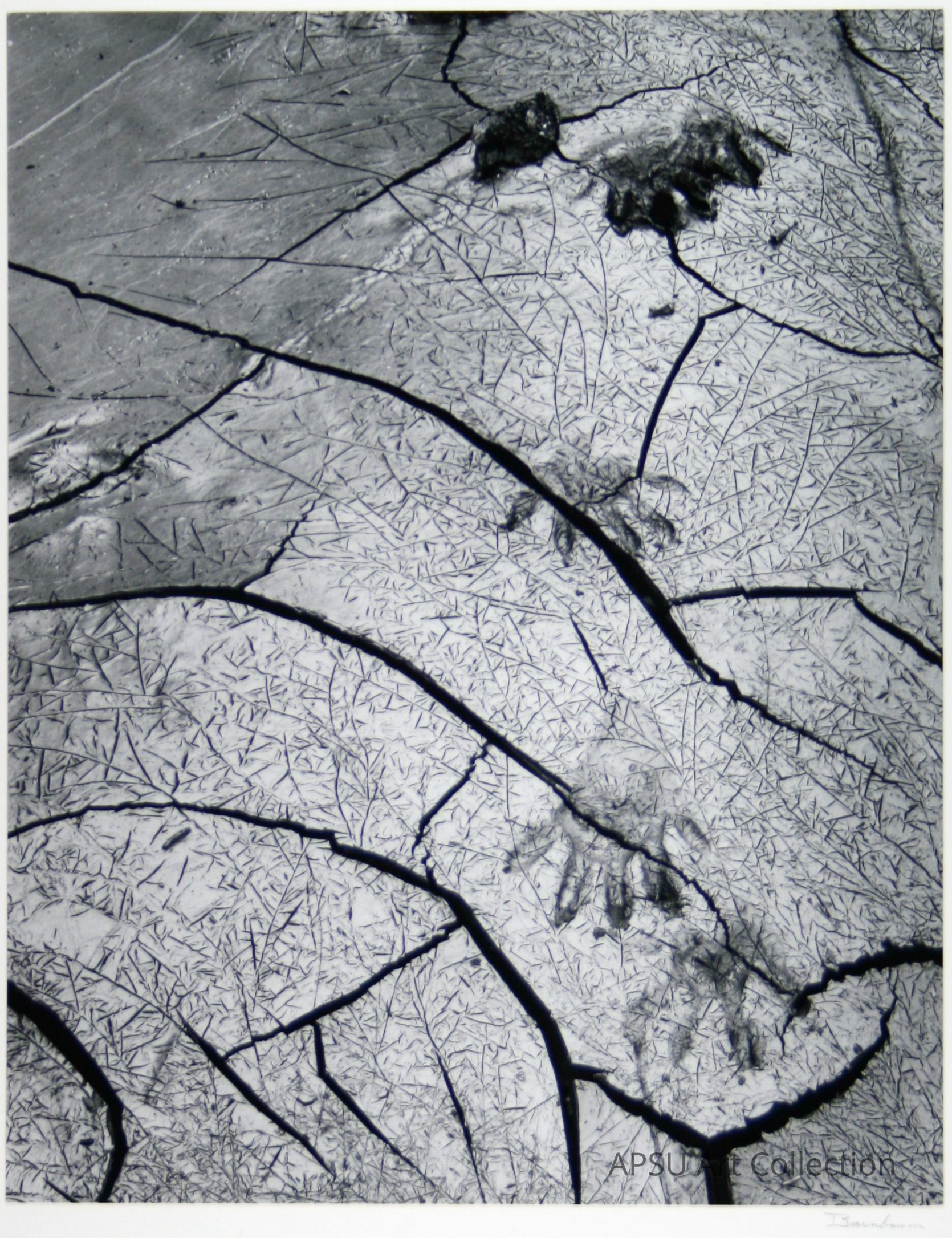 Black and white gelatin silver print of raccoon tracks on dry cracked mud after a forest fire.Collection