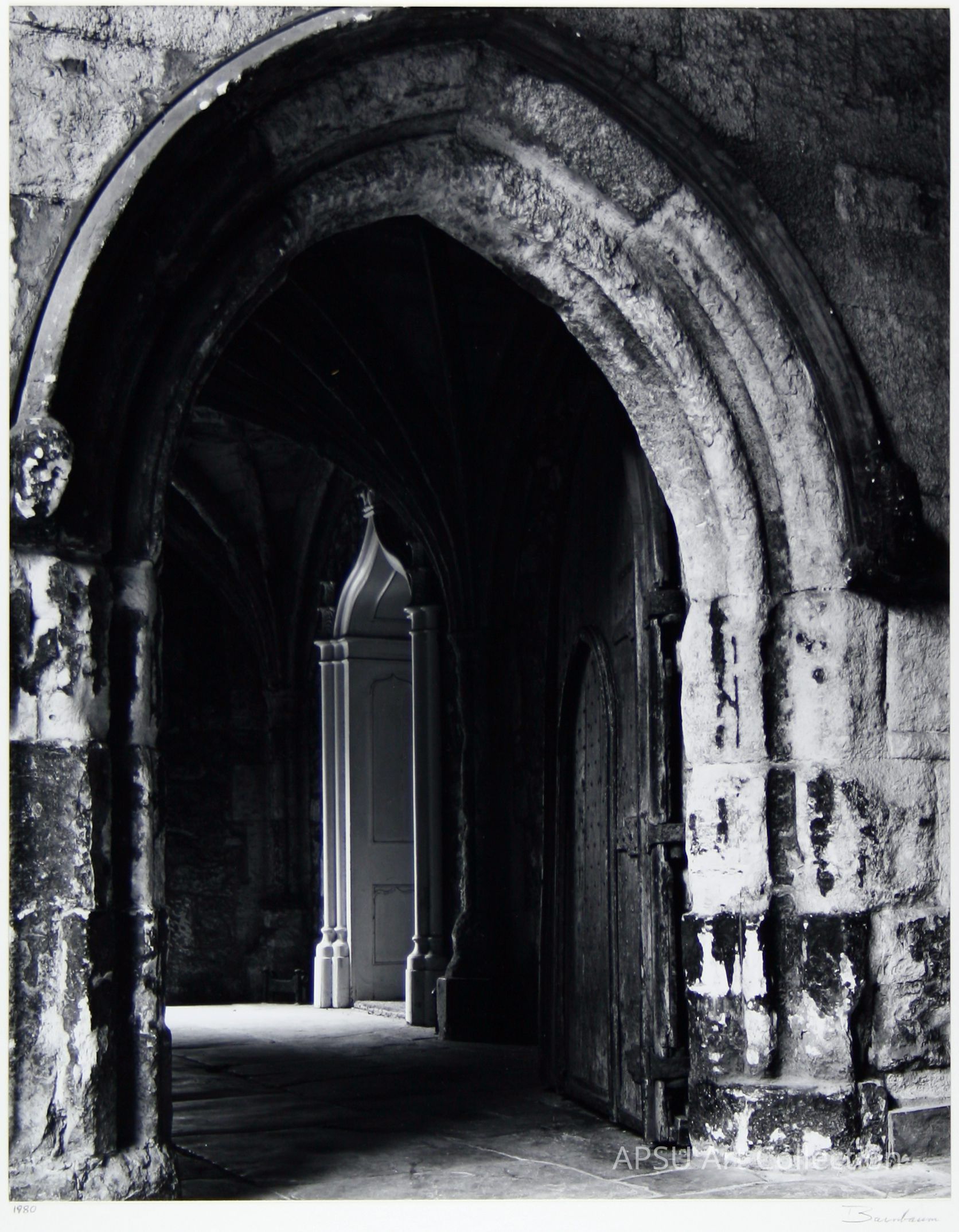 Black and white gelatin silver print of the entrance into the Dean of Westminster's office, ancient wood door open to the interior hallway and white painted wood door of the Dean's office that contrasts with the dark time worn bricksCollection