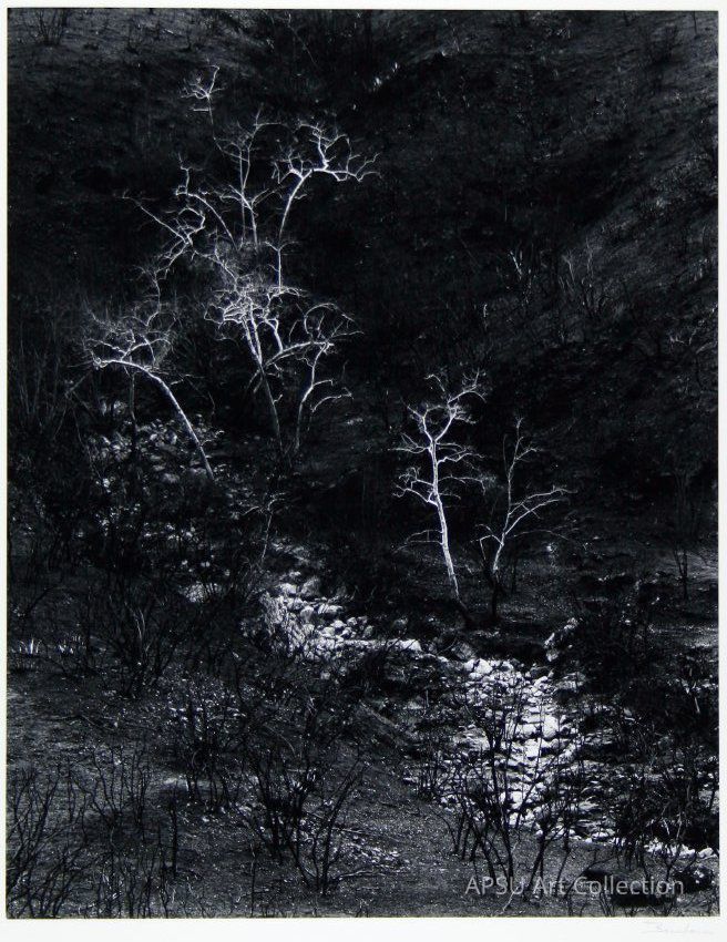 The image depicts a stark, monochromatic landscape with a dark background, punctuated by the bright, bare branches of several trees standing in sharp contrast to the surrounding darkness, giving an eerie, almost ethereal atmosphere to the scene; the ground is uneven and appears to be covered with sparse vegetation, creating a sense of desolation and stillness in this strikingly captured natural environment.