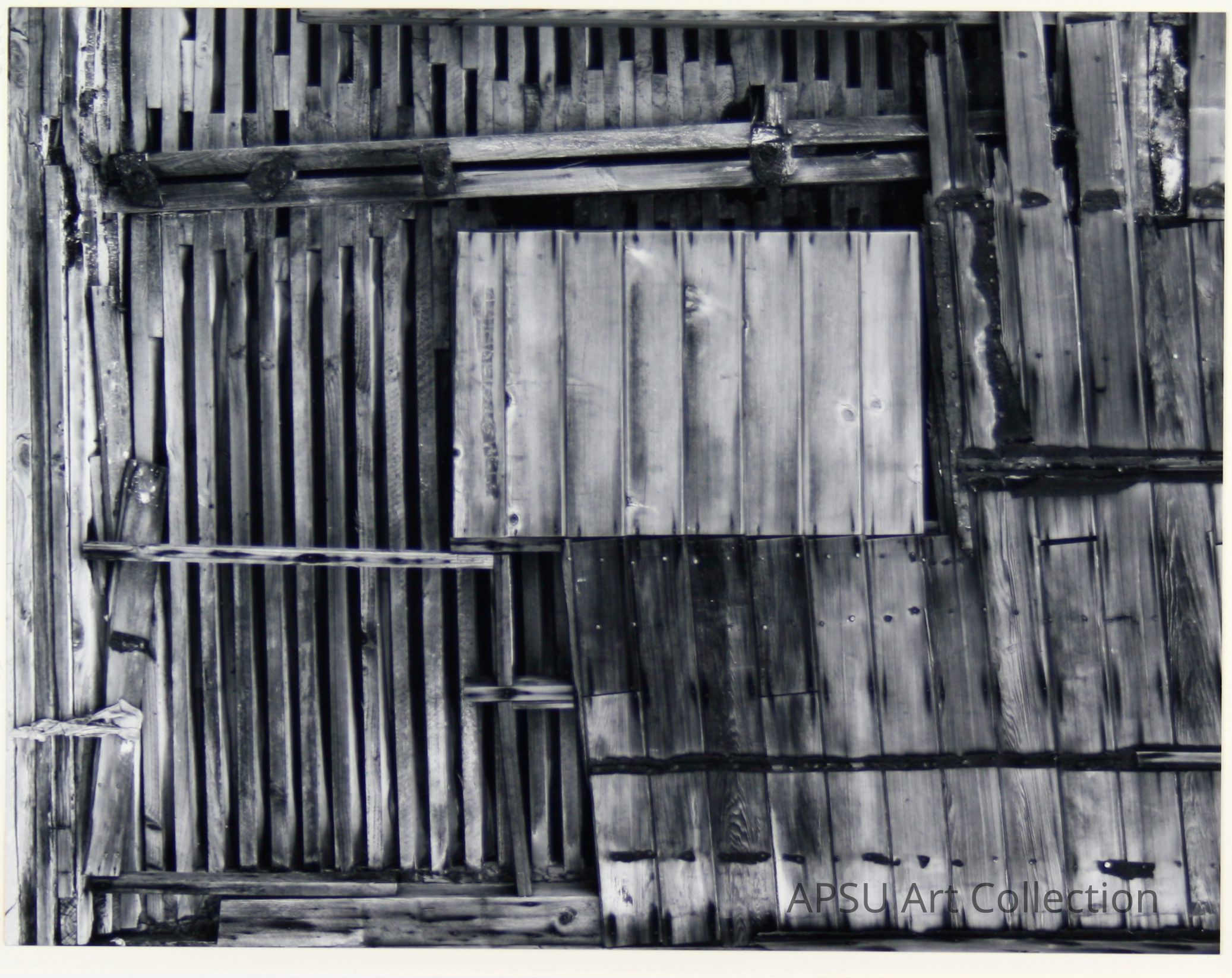 Black and white gelatin silver print of weather wood composing a building's wall, the lines of the wood have varying quality, the variation between darks and lights of the wood with areas of black between the wood, remnants of a covering remain creating subtle vertical lines attached to the nails, Pacific Grove, CA, 1978Collection