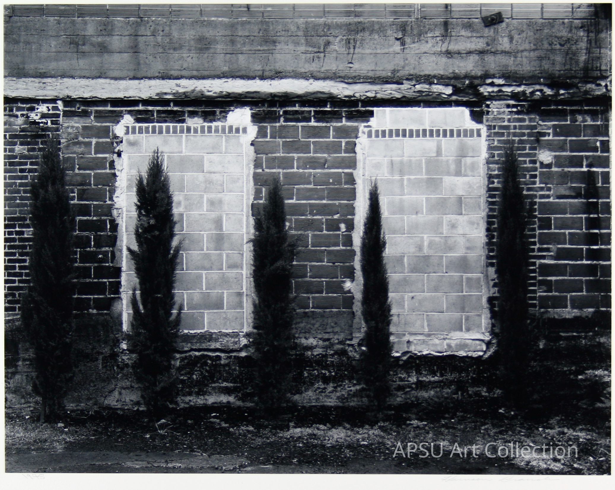 Black and white gelatin silver print of repetitive black trees in front of a brick wall with two symmetrical rectangles of light colored brickCollection