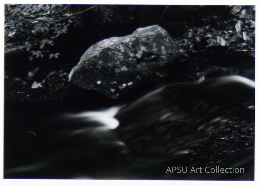 Black and white gelatin silver print of dark water rushing past a rock on the bank of a stream, the mist coming off the rock captured by the photograph created a white fog like form, Ravine, CT, 1972Collection