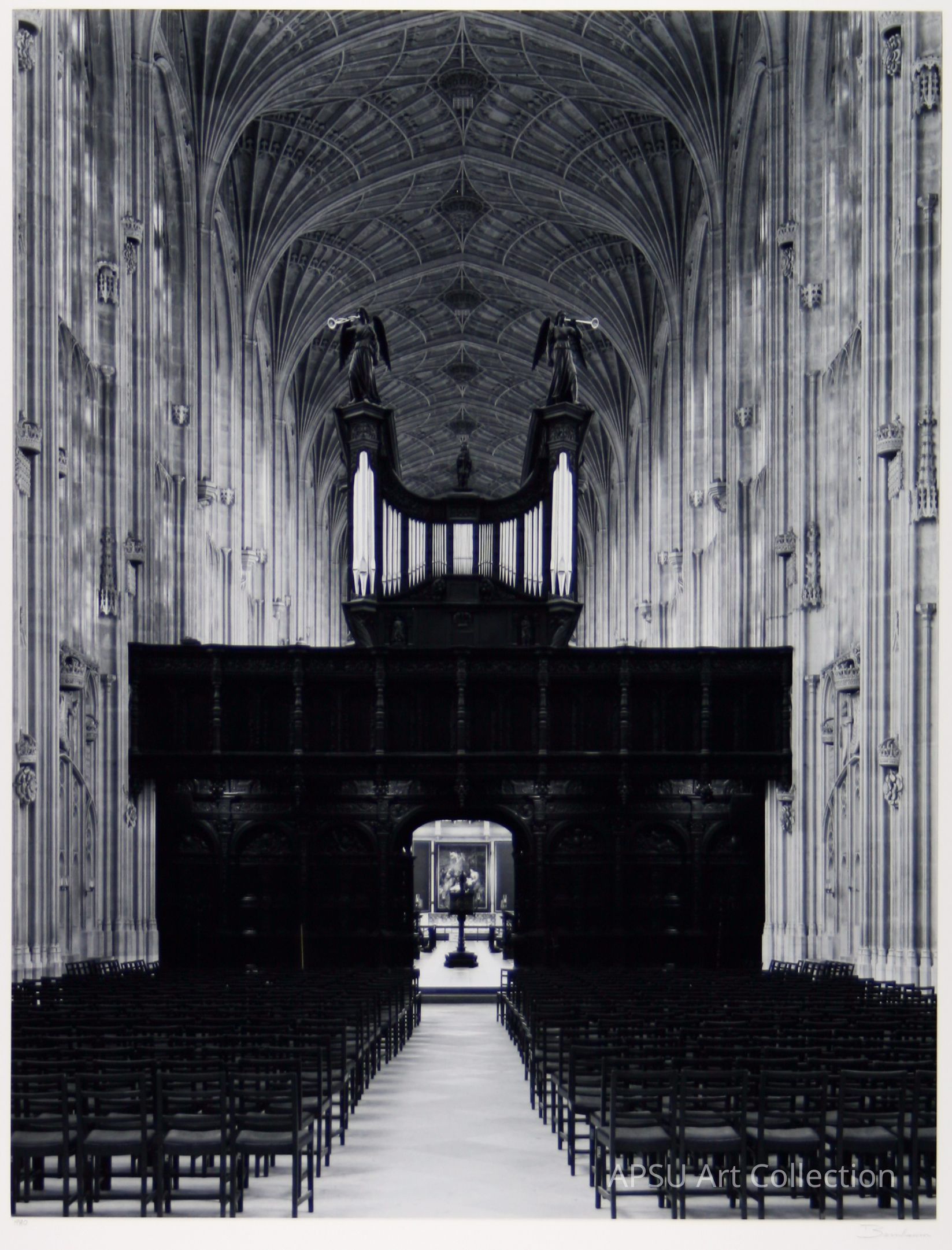 The image depicts the interior of a grand, Gothic-style cathedral with elaborate fan vaulting on the ceiling, intricately carved stonework adorning the tall walls, and an expansive aisle flanked by rows of empty chairs. In the center, an imposing organ with tall pipes stands above a dark, ornately designed wooden screen that stretches across the width of the space. The symmetrical design draws the eye towards the altar area at the far end, partially visible through the archway, highlighting a beautifully lit artwork.