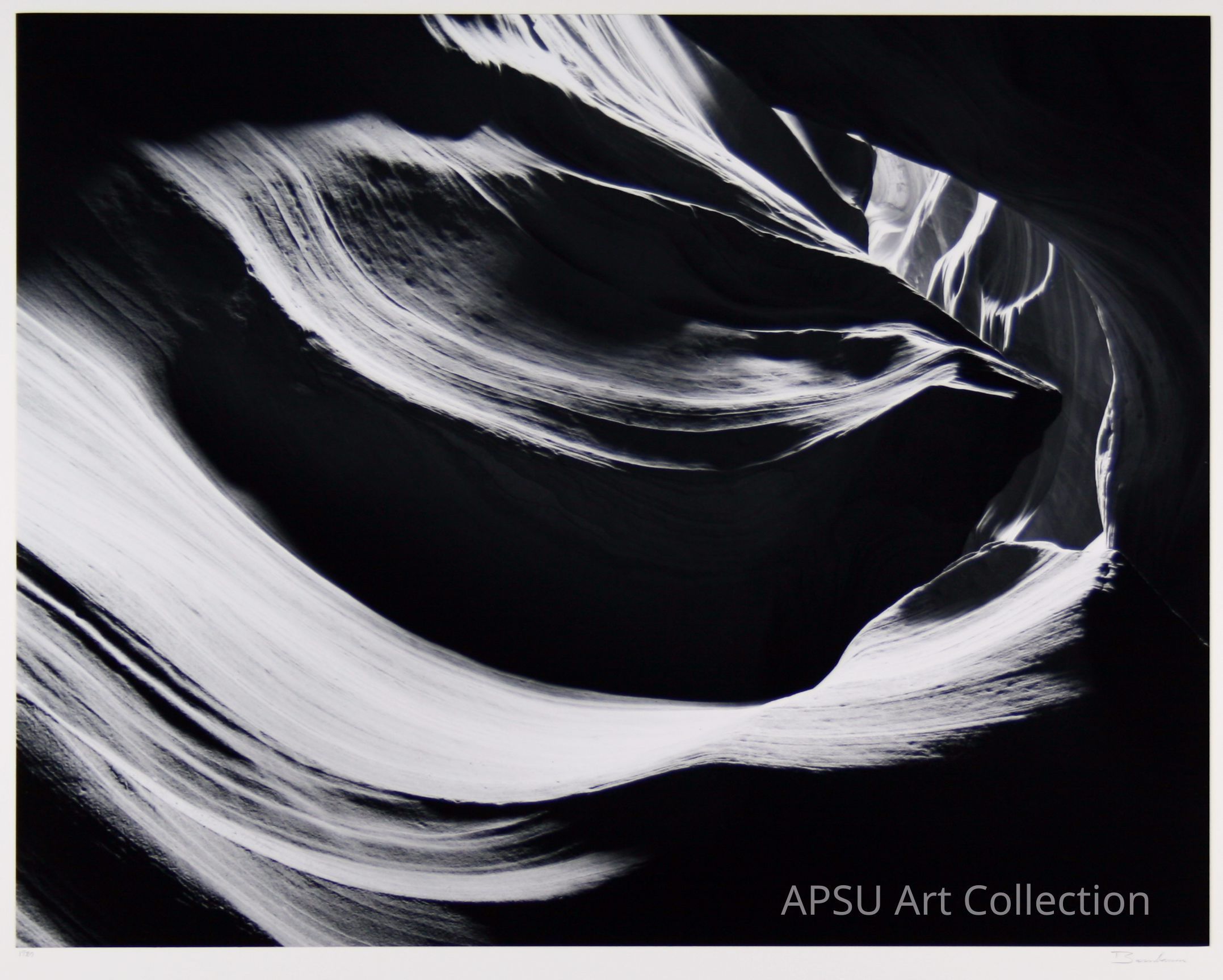 The image depicts a stunning black and white photograph of an abstract, smooth, and curving rock formation, reminiscent of the famous Antelope Canyon in Arizona, with light and shadow creating a mesmerizing contrast that highlights the intricate details and flowing textures of the geological marvel, evoking a sense of calm, timeless beauty, and nature’s artistic prowess.