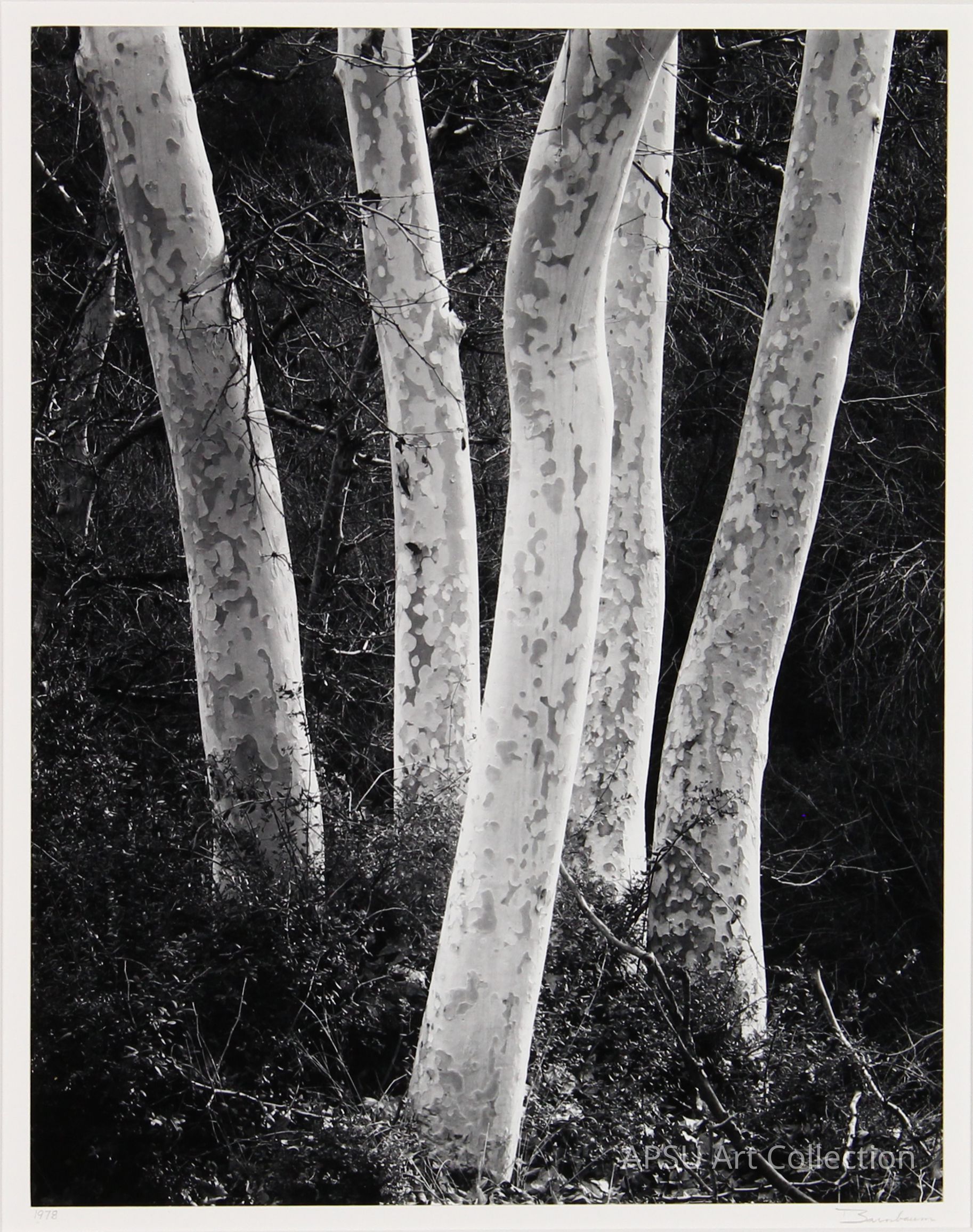 In this striking black and white photograph, a group of tall, slender trees with smooth, pale bark stand gracefully together, their elegant trunks rising from a tangle of dark foliage; the contrast between the lightness of the bark and the shadowy background enhances the texture and form of the trees, while the intricate details of branches and subtle patterns on the bark add depth and dimension to the composition, evoking a serene, natural beauty that captures the viewer's eye.