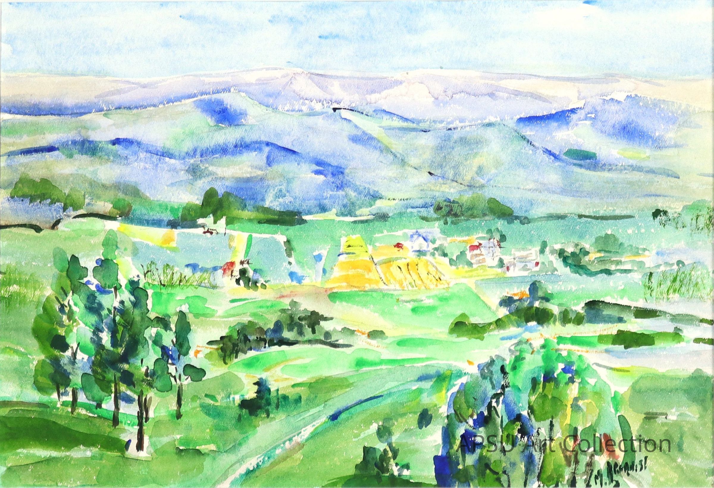 Unknown artist and title, signature bottom right unclear, watercolor landscape paintingType of Painting