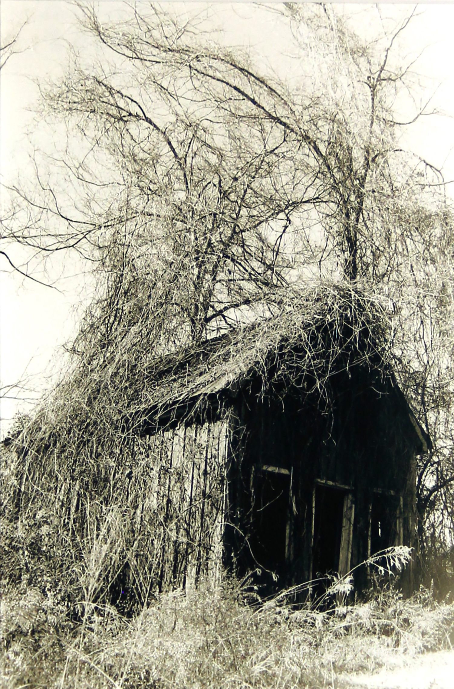 Sepia toned black and white photograph of an old vegetable barn covered in vegetatation. on website