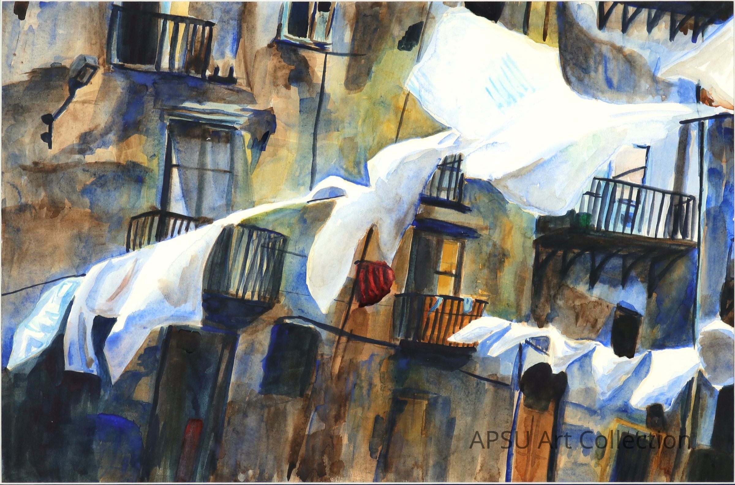 Unknown artist and title, possible alumni work, watercolor of clothes lines between buildingsType of Painting