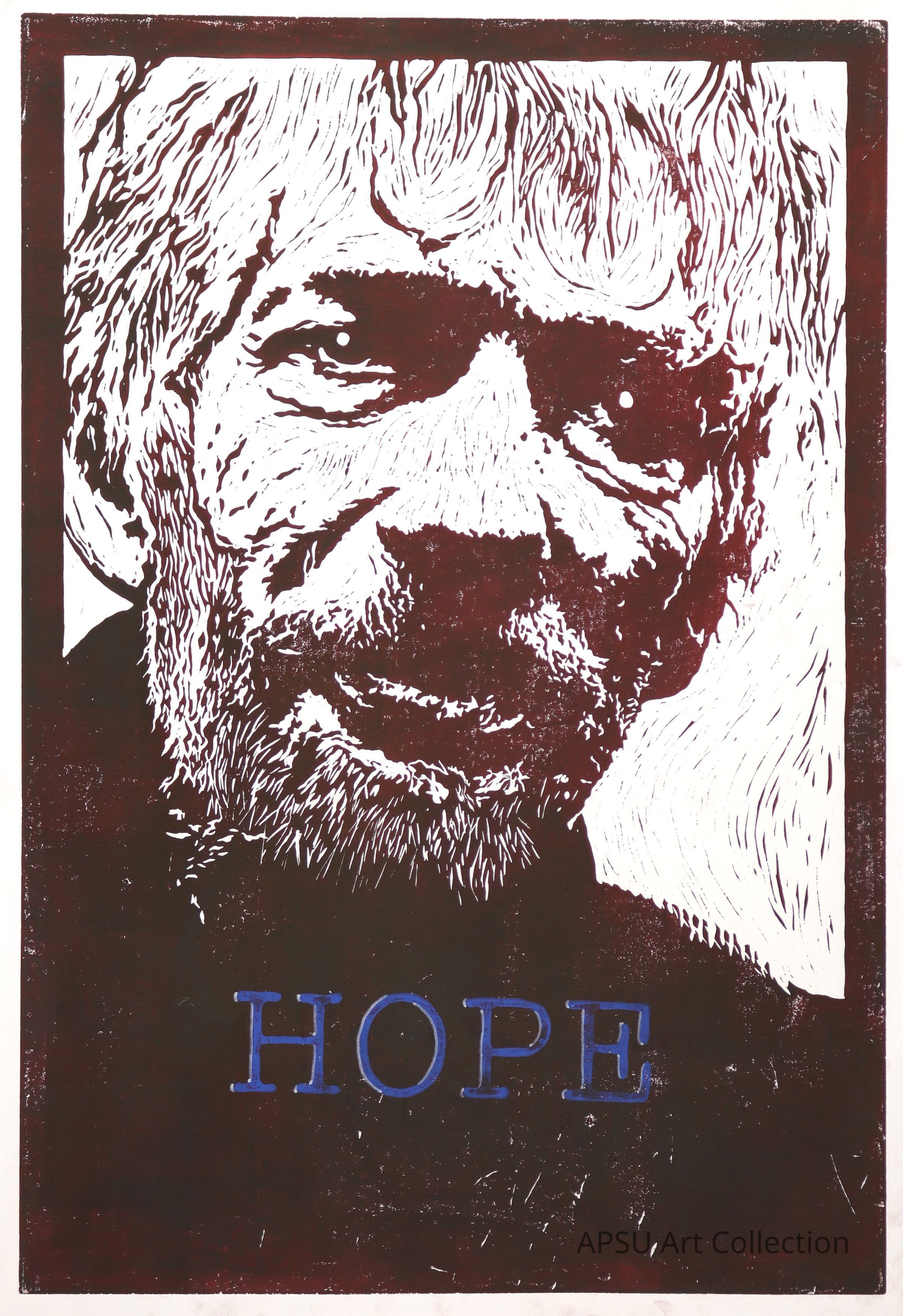 Stephen Graham, "Hope", multiple woodblock print, portrait with "Hope" on the bottom, CECA purchase award from Student Art ShowType of Print