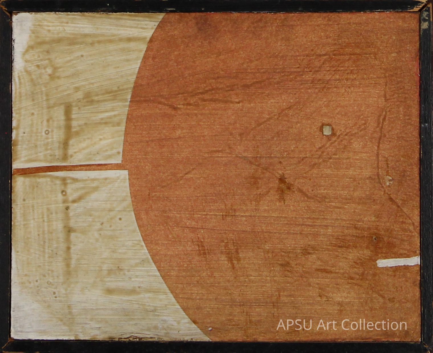 Oil stain on masonite. red orange circle next to two large blocks of off white/brown