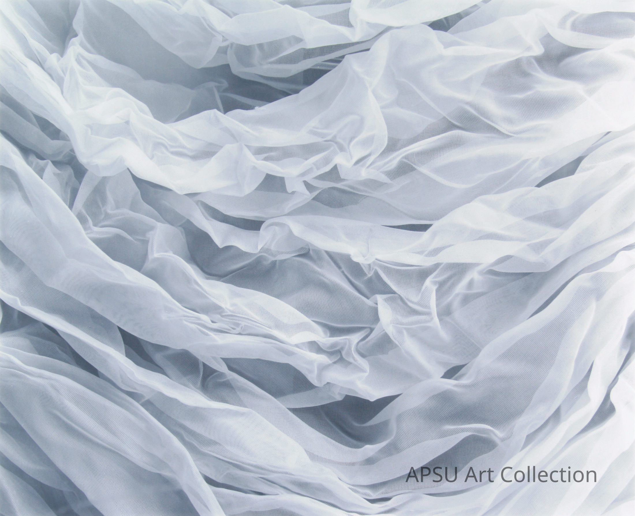 The image features a gentle array of soft, translucent, white fabric folds that undulate gracefully, creating a delicate pattern of waves and ripples that evoke a serene, ethereal quality akin to a calm sea or gentle clouds. The sheer texture of the fabric adds a touch of elegance and sophistication, making it visually appealing and soothing to observe.