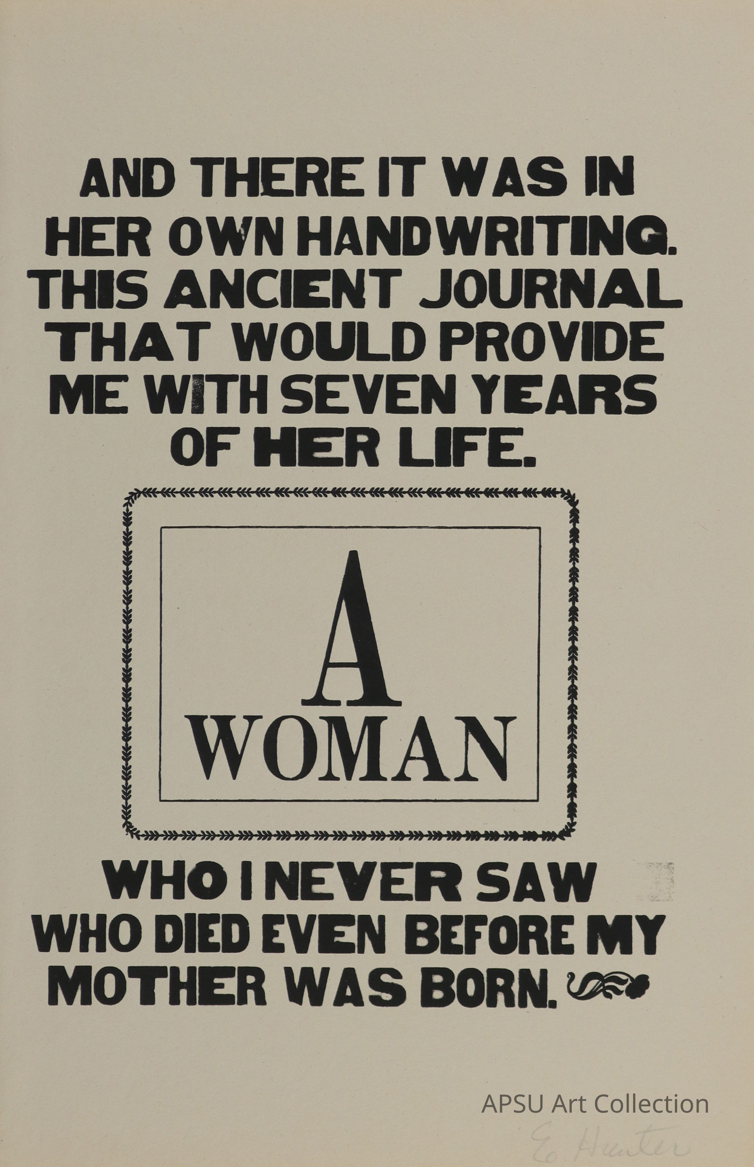 Tell me a Story is a collaborative community project that began as a tool to uncover common ground; a cultural history or, perhaps, a cultural promise specific to the city of Clarksville, Tennessee. Citizens of different generations (representing a full-house of experience) were invited to create written and visual narratives about memorial moments in their lives. The broadsides included in this portfolio are the products of their effort. We hope you enjoy the broadsides and can find a few common threads that relate to your life and your memories.Type of Print